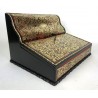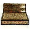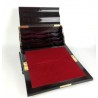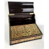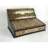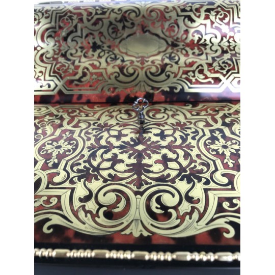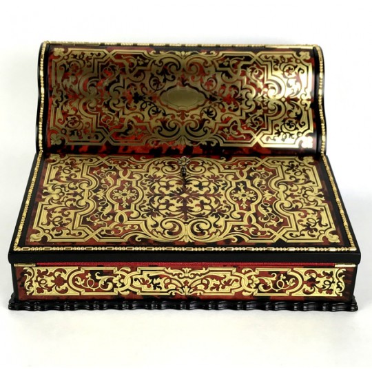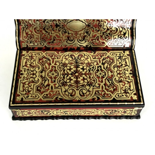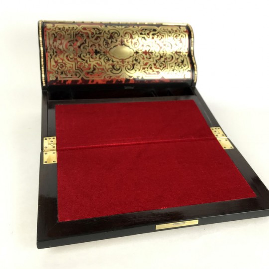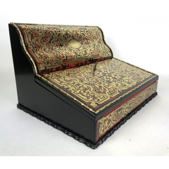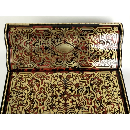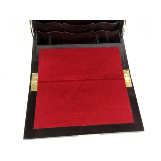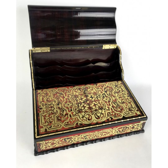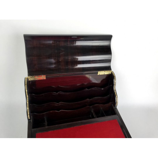 Brass, red material and blackened pear wood marquetry, Rods of beaded bronzes around the perimeter, Rosewood interior, mail compartment, velvet replaced, has its two original inkwells, one with the damaged stopper