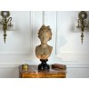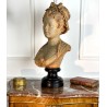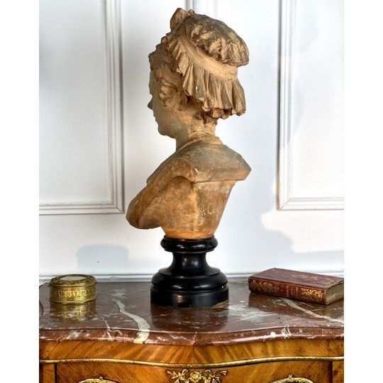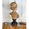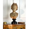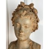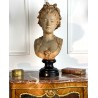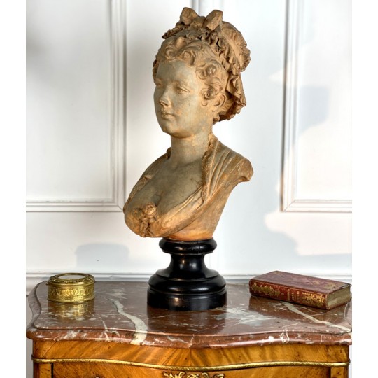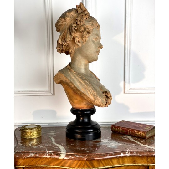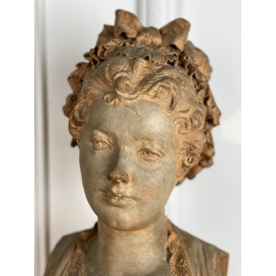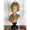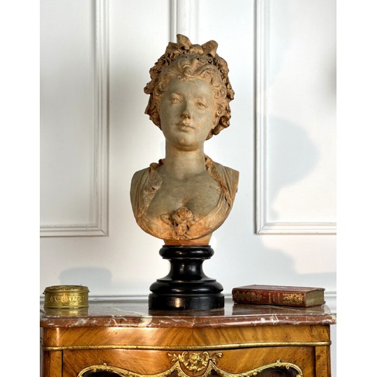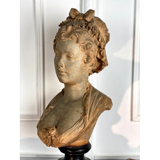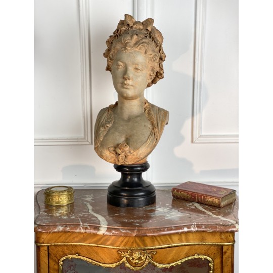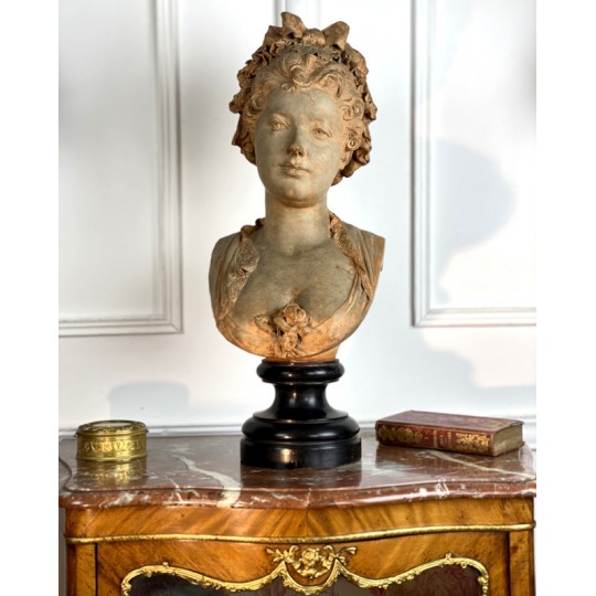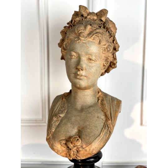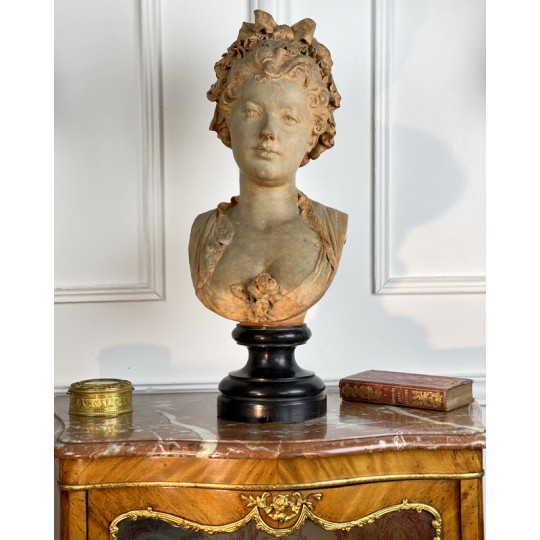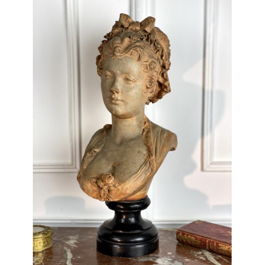 Bust of a young woman with a chest decorated with a rose, patinated terracotta plaster proof, signed Albert Ernest Carrier Belleuse. Placed on a wooden plinth.