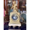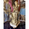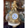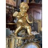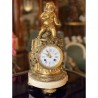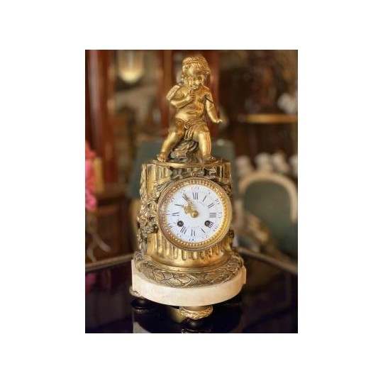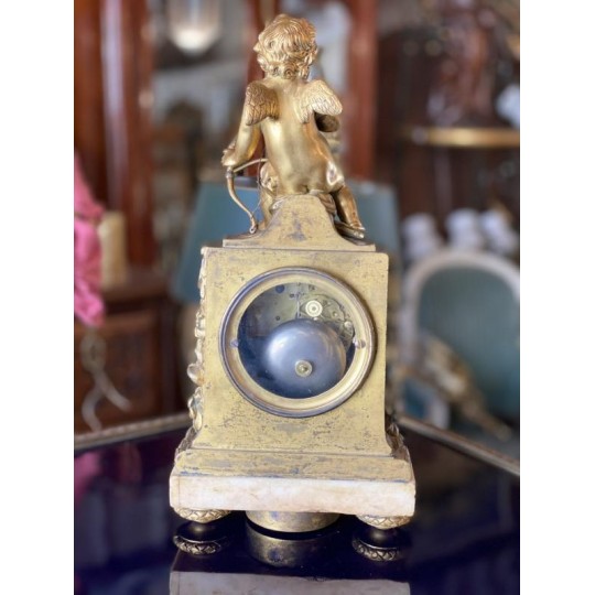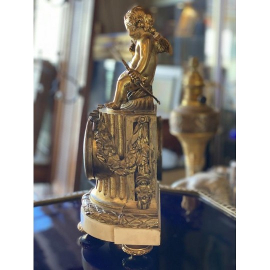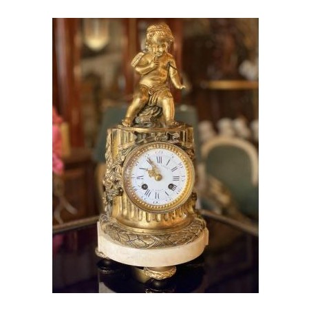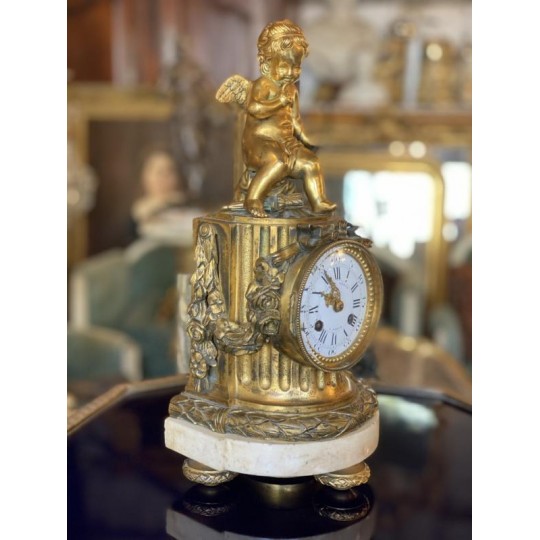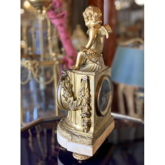 Louis XVI style cupid clock, in gilded bronze, white marble base, it is decorated with garlands of flowers and bay leaves. the dial is signed Julien Leroy in Paris. Manufacture of the first half of the 19th century, wire balance.