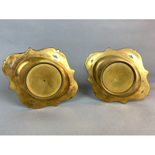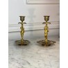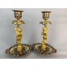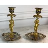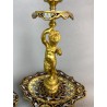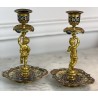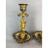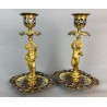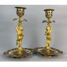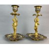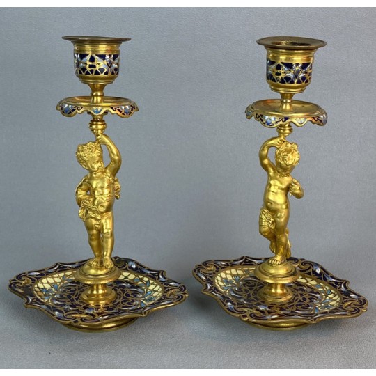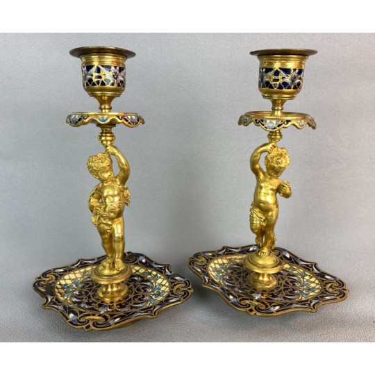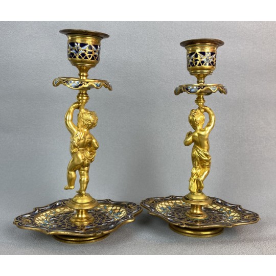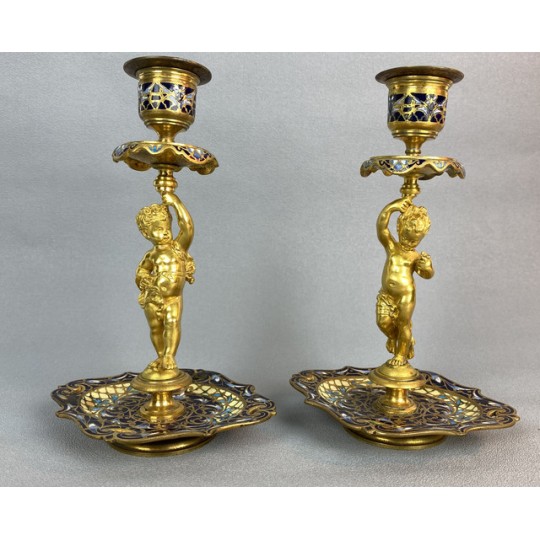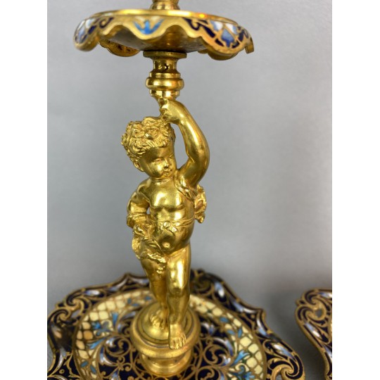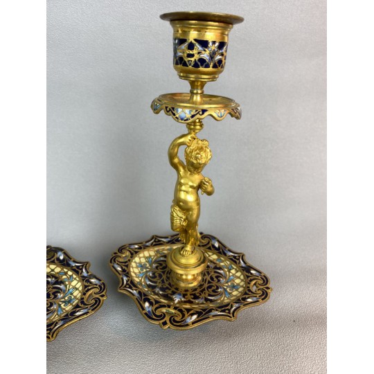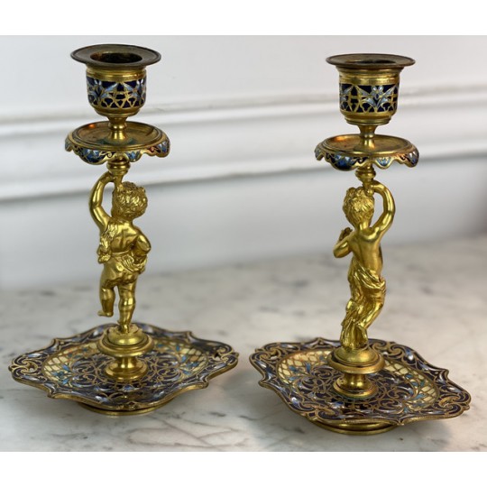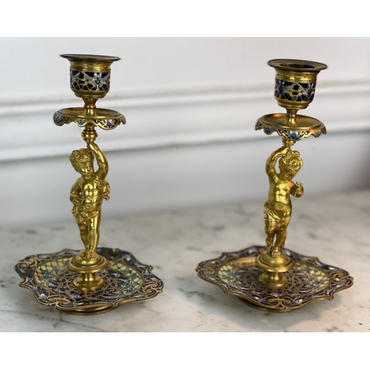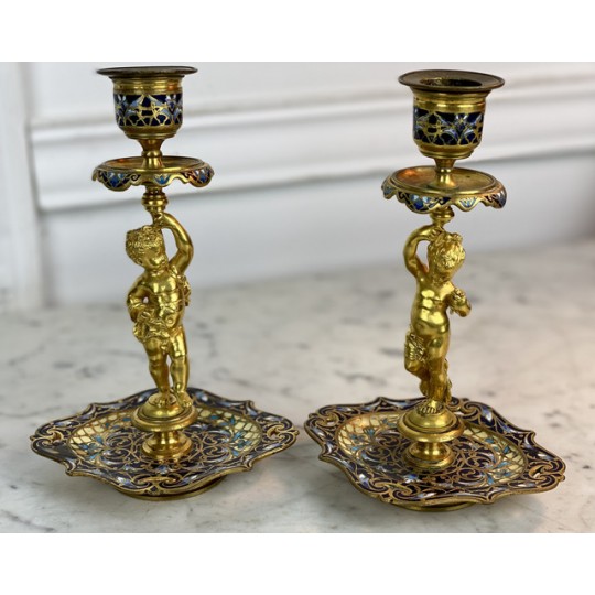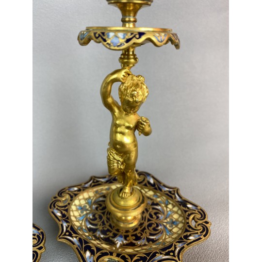 Pair of 19th century candlesticks in the style of Barbedienne in gilded bronze and polychrome enamels (cloisonné), decorated with a light door child.