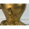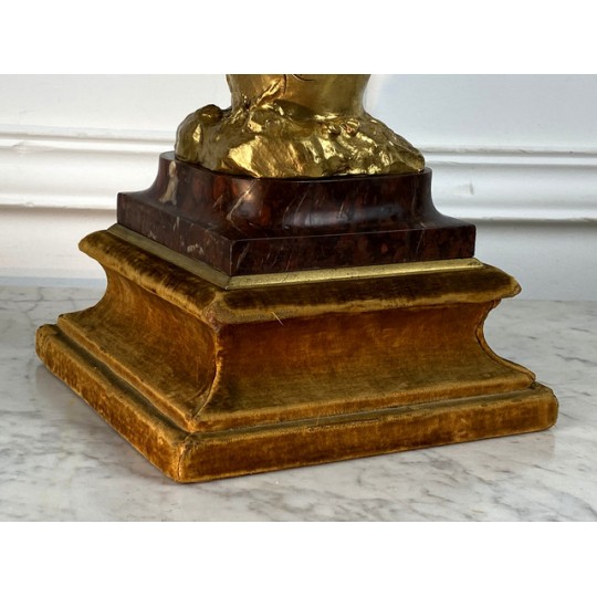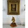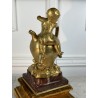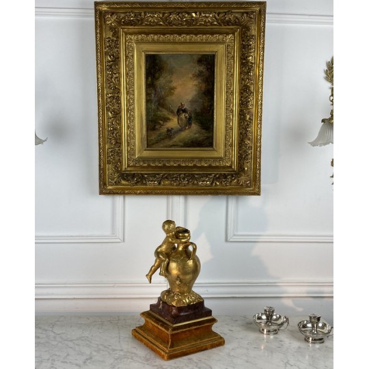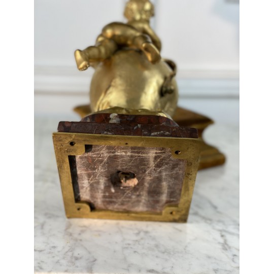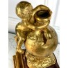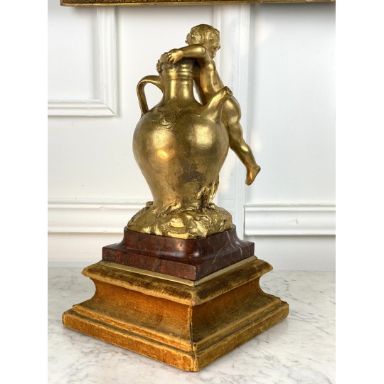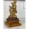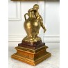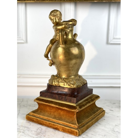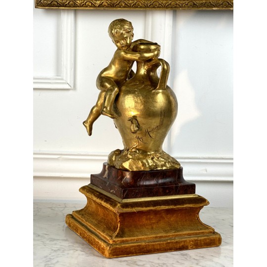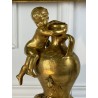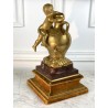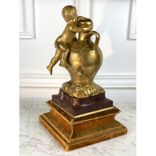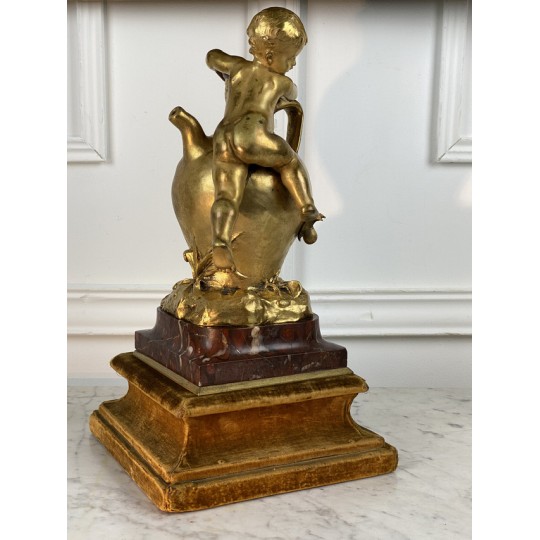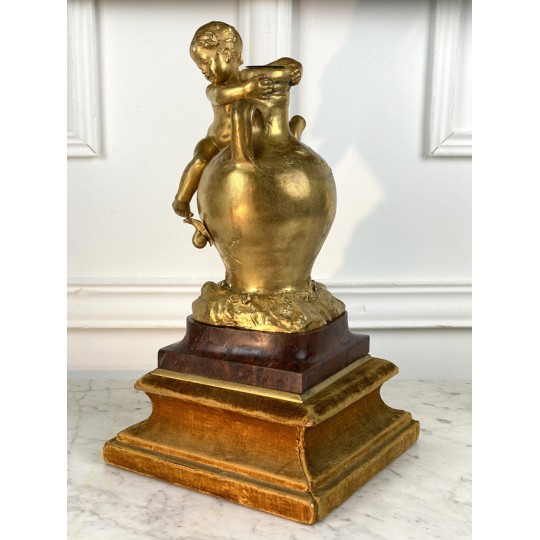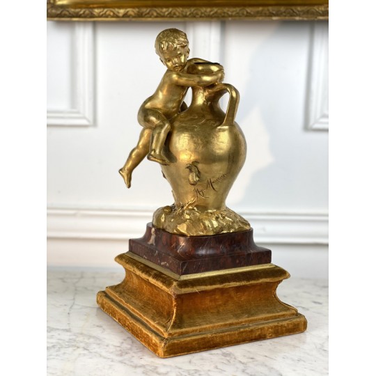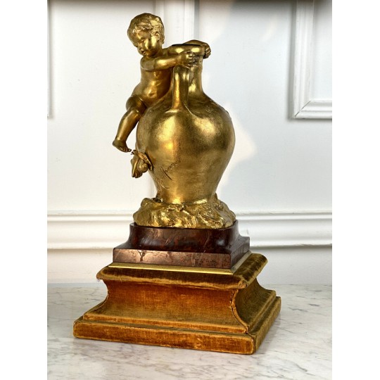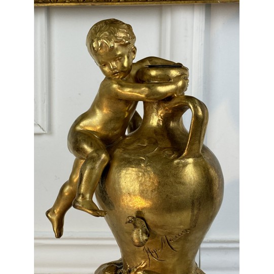 Hippolyte Moreau (1832-1926), Gilt bronze decorated with a child and the snail in the shape of a vase, 19th century, on a red marble base. Beautiful original gilding