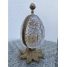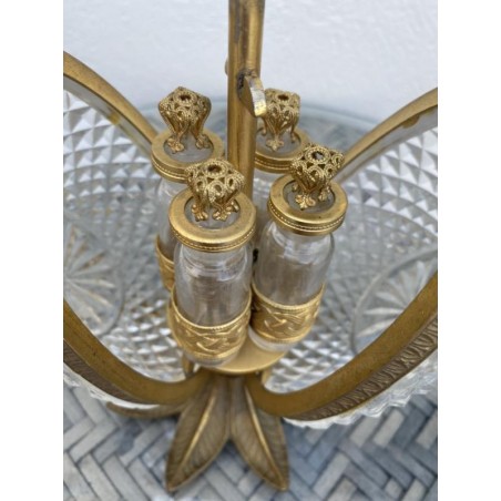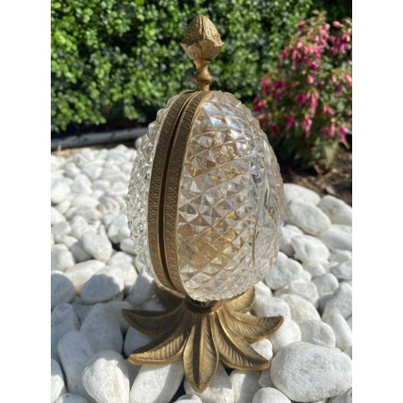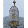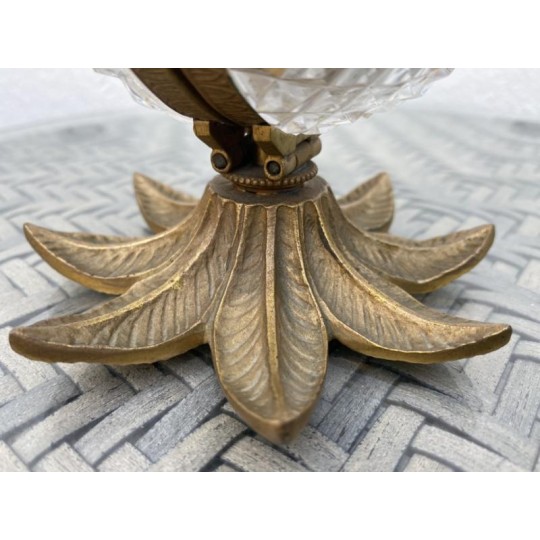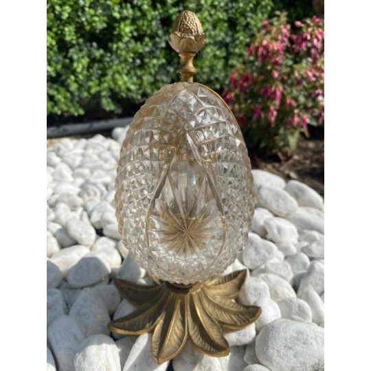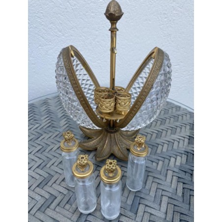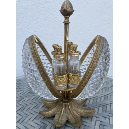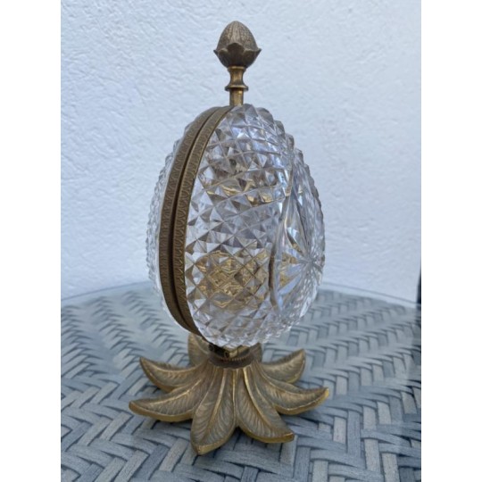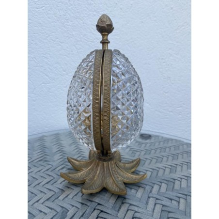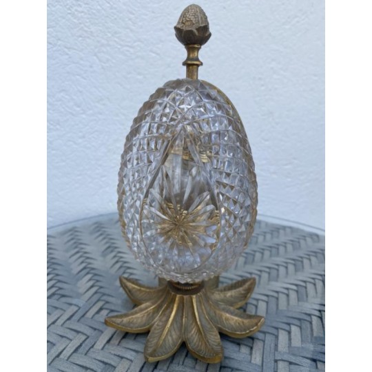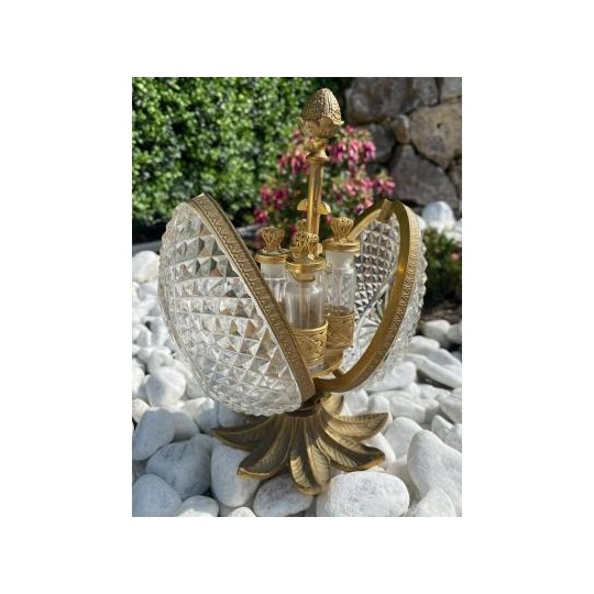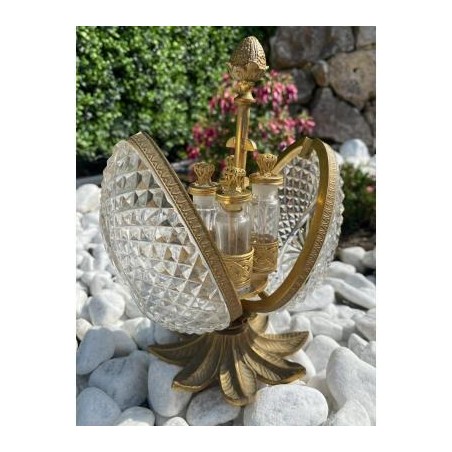 Superb Charles X style scent box, forming a cut crystal egg, the structure is in bronze and gilded brass. The egg opens by its half and reveals four small scent bottles, topped by a brass ornament. Very nice achievement from the middle of the 20th century.