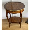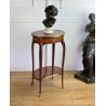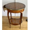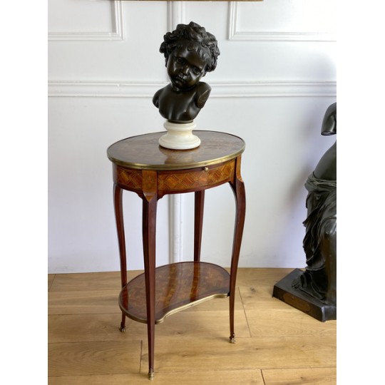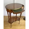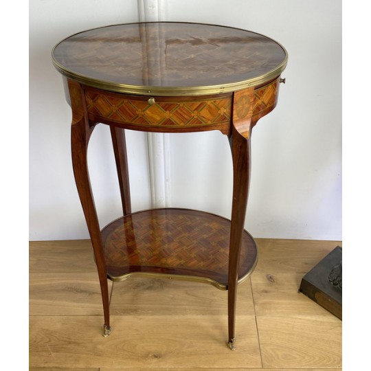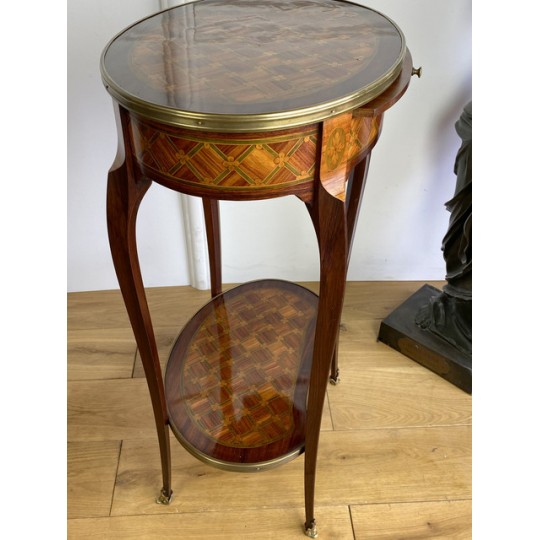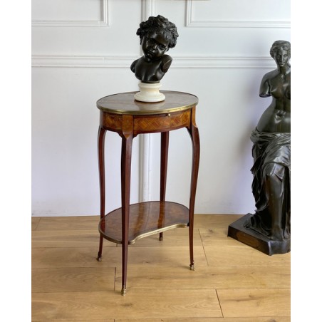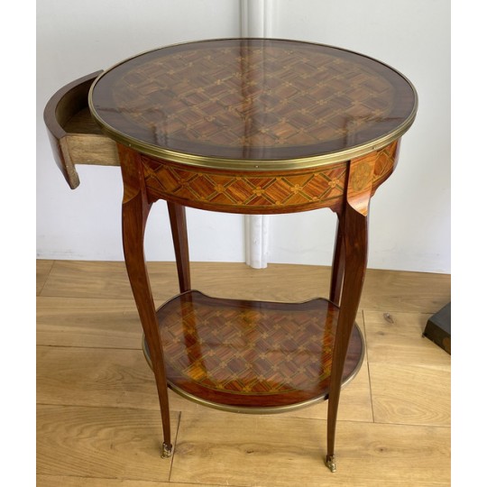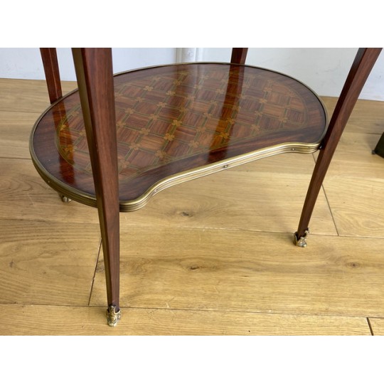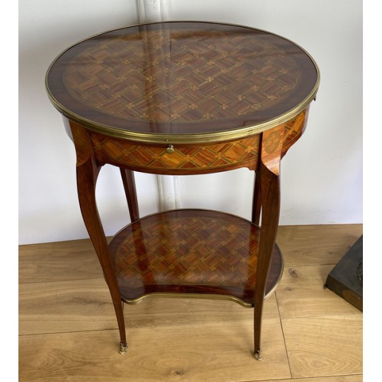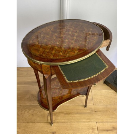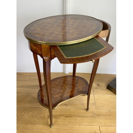 Louis XV style inlaid living room table stamped "Escalier de cristal". Living room table in rosewood veneer and marquetry of amaranth fillets with lattices and flowered buttons. it opens with a side drawer and a belt zipper and rests on four arched feet joined by a kidney-shaped spacer shelf.