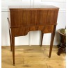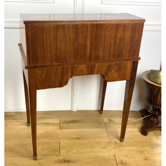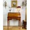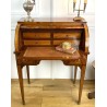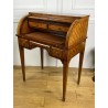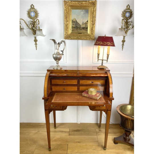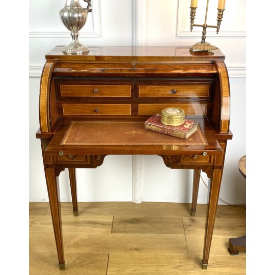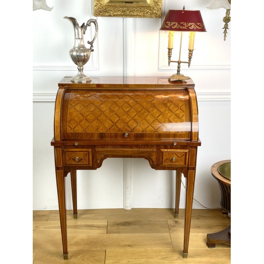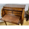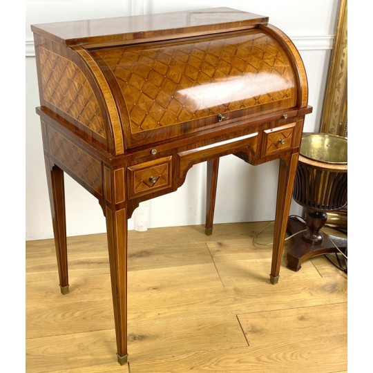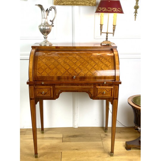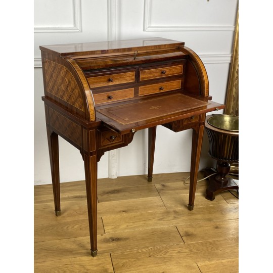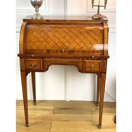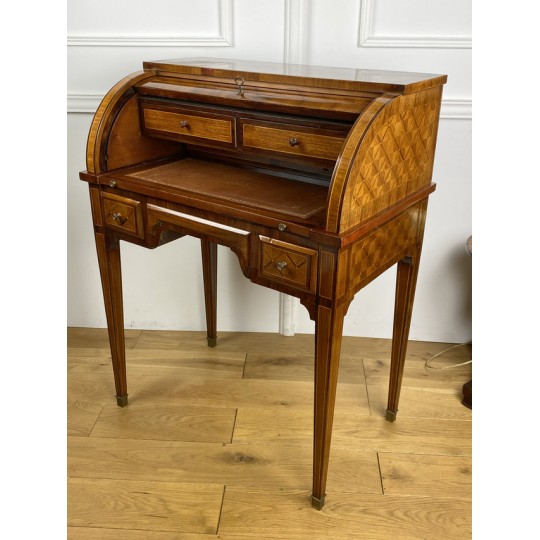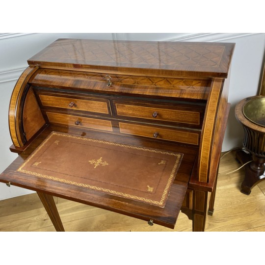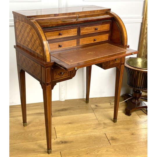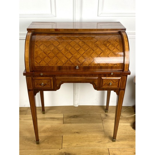 Cylinder desk in marquetry decorated with Napoleon III period braces. The cylinder releasing a work surface and two drawers. It opens with two drawers and rests on four sheathed feet. The cylinder desk, also known as the cylinder secretary, is a form of desk that resembles the Mazarin desk or flat desk equipped with a nest of shelves and drawers in the background and a work surface in the foreground. A quarter-circle curtain slides to allow the office to be closed.