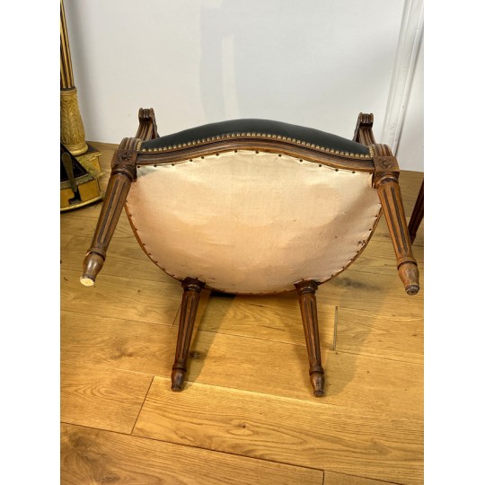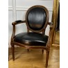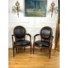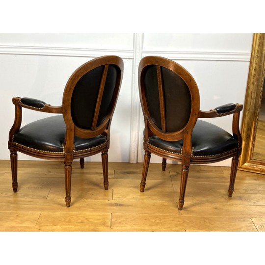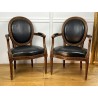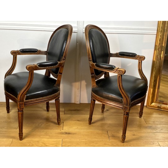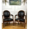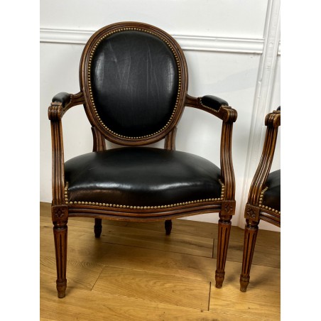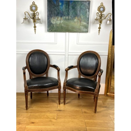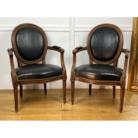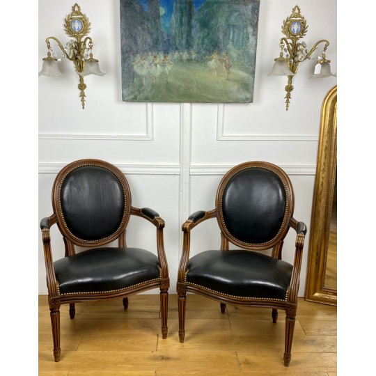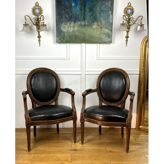 Pair of Louis XVI Style cabriolet armchairs in wood and leather, year 1900