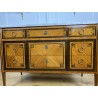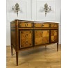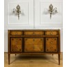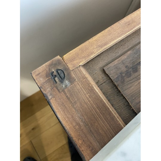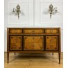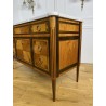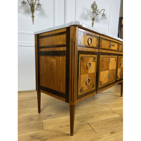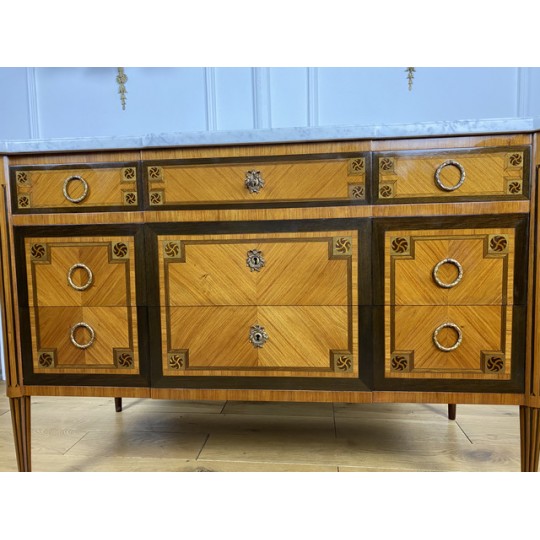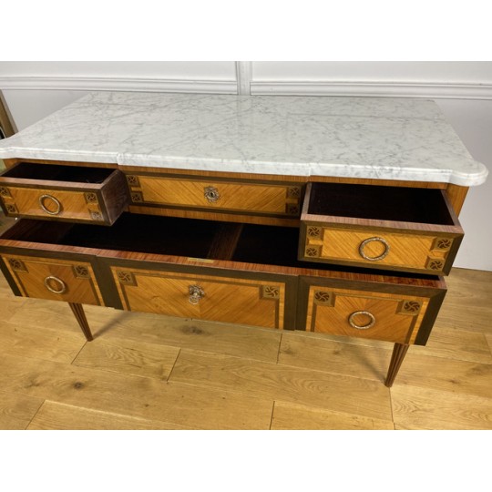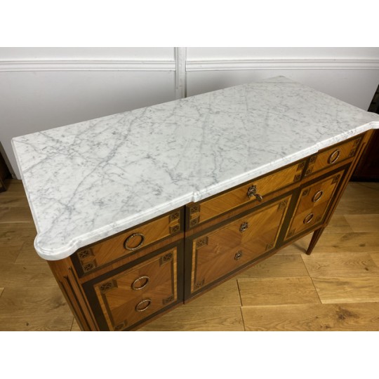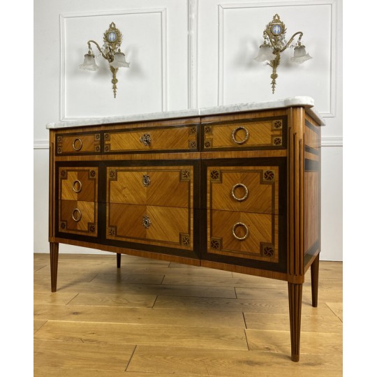 Antique Louis XVI style chest of drawers in marquetry stamped "FD" from the Faubourg Saint Antoine in Paris, opening with 5 front drawers, from the 1920s, white marble top