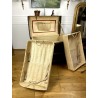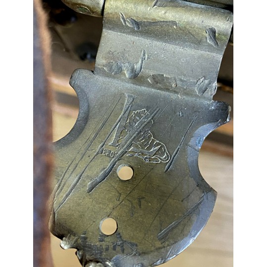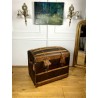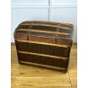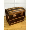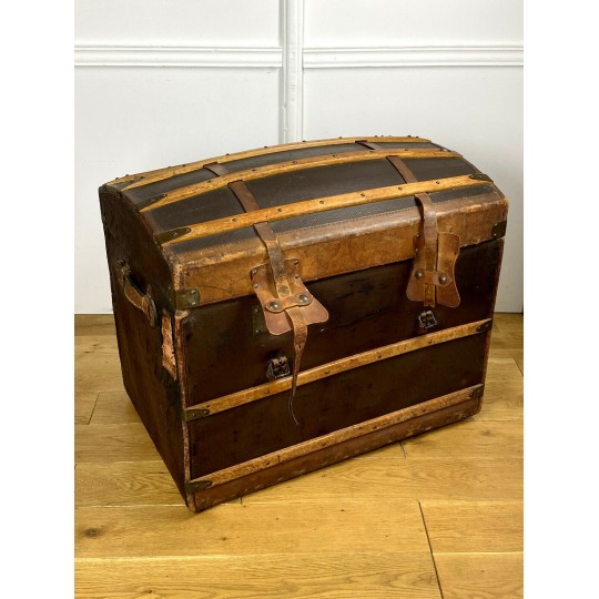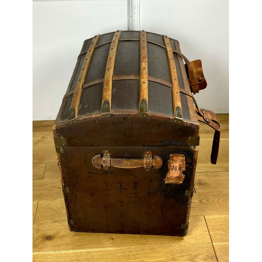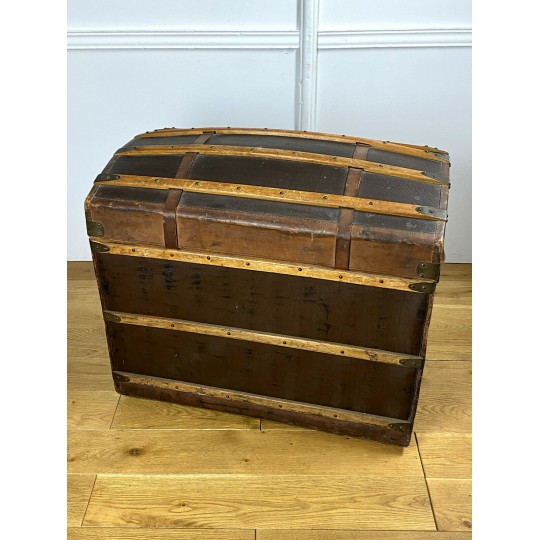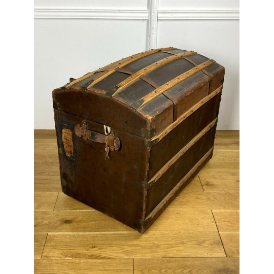 Old domed trunk covered with leather and wooden slats. The exterior needs renovation but the interior is in good condition. Small marks on the locks.