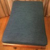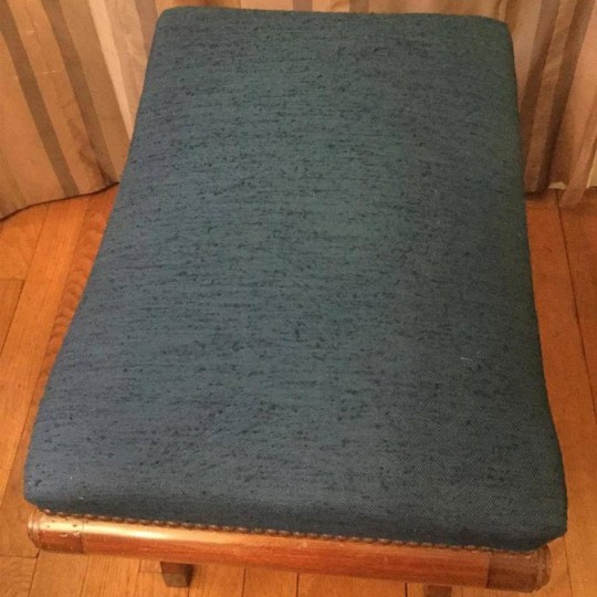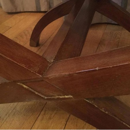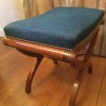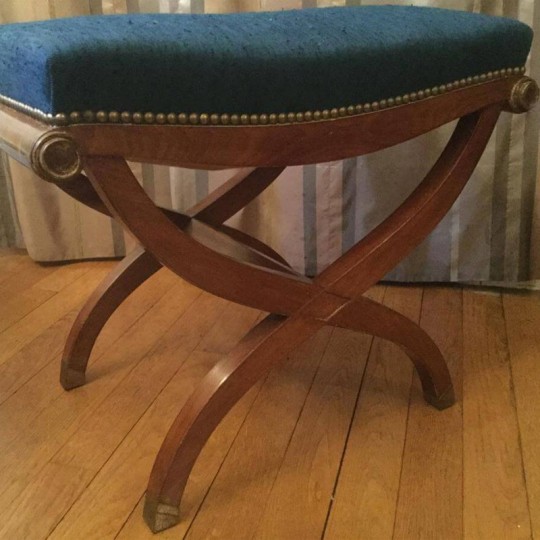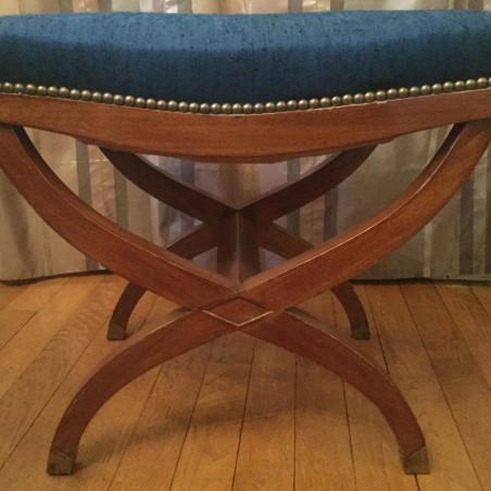 Charming ottoman in art deco style mahogany, X-shaped legs, the toes are in brass, upholstered in blue.