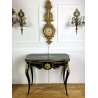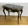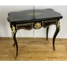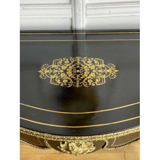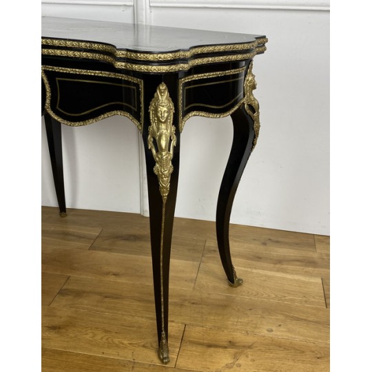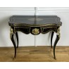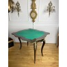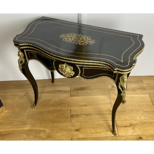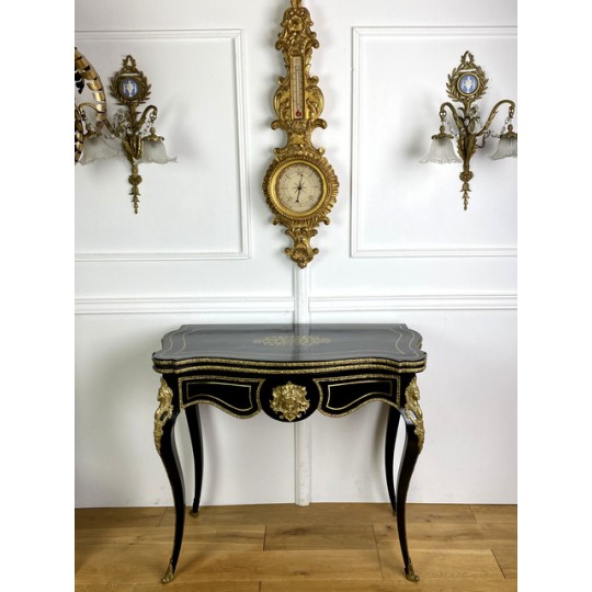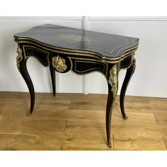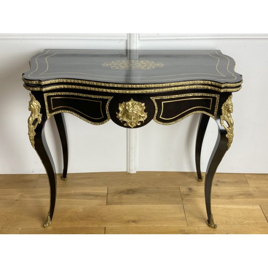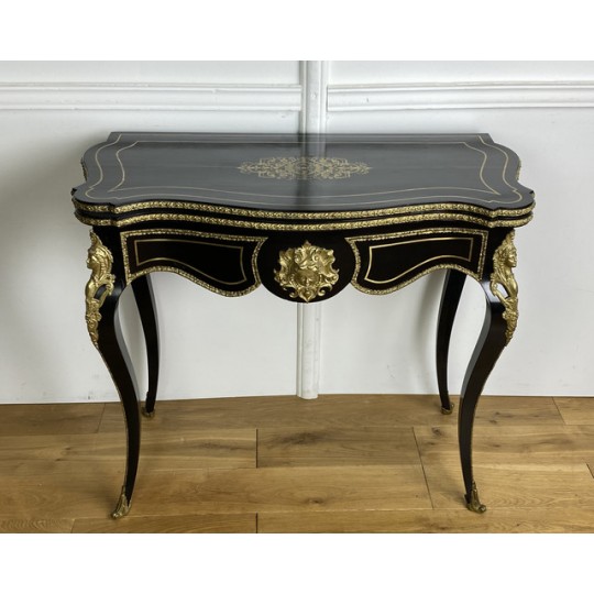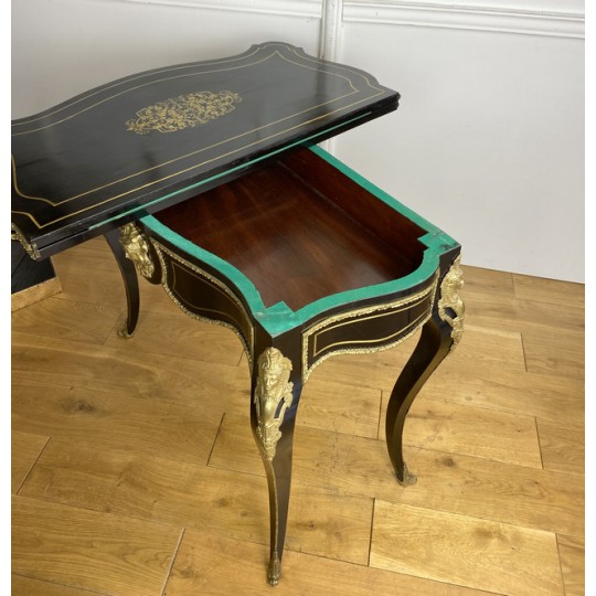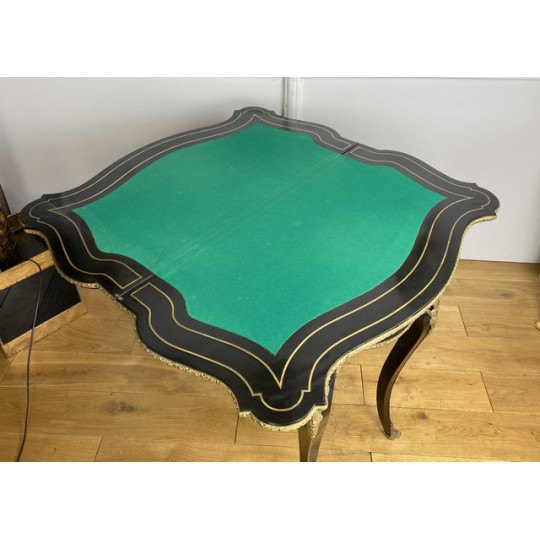 Game table in blackened wood veneer, and brass. The contoured wallet tray lined with green velvet rests on four curved legs. Rich gilded bronze trim including ingot mold with laurel leaves, friezes of rais-de-coeur, head of Bacchus applique, amounts with Spanish slips and foliated winding glides. Napoleon III period.