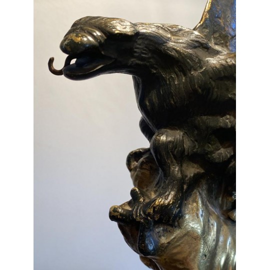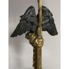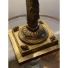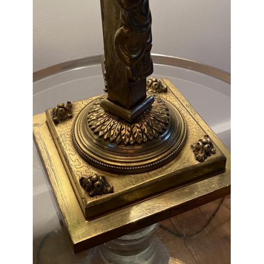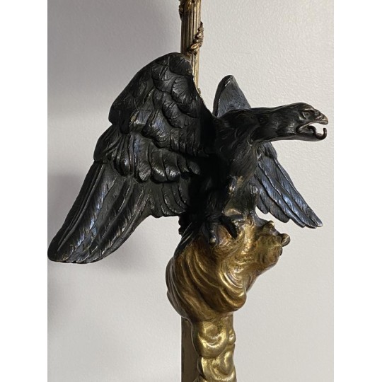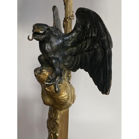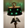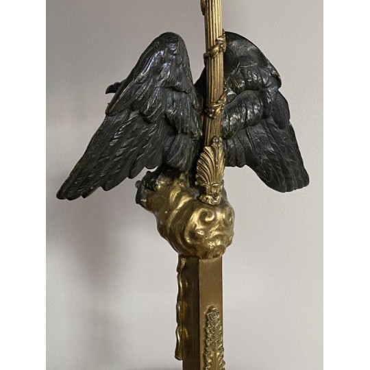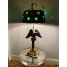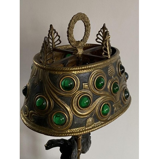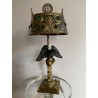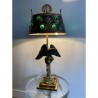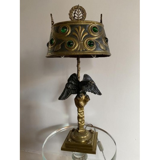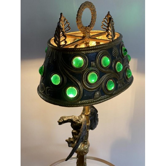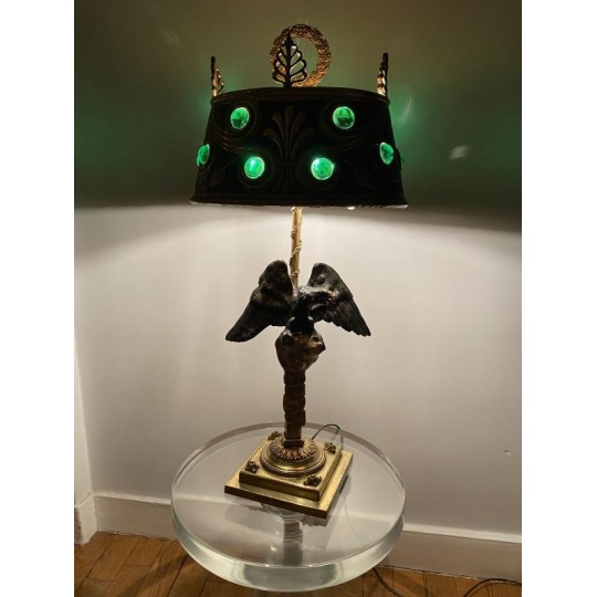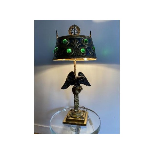 Superb hot water bottle in Empire style in bronze and brass, the central shaft is surmounted by an eagle with outstretched wings, in bronze with brown patina, making a watch holder. The fixed embossed brass lampshade with palm leaves and pine cones, the light radiates through green glass cabochons. The lamp is lit by two conventional bulbs, the electrification is good.
