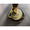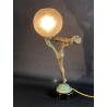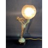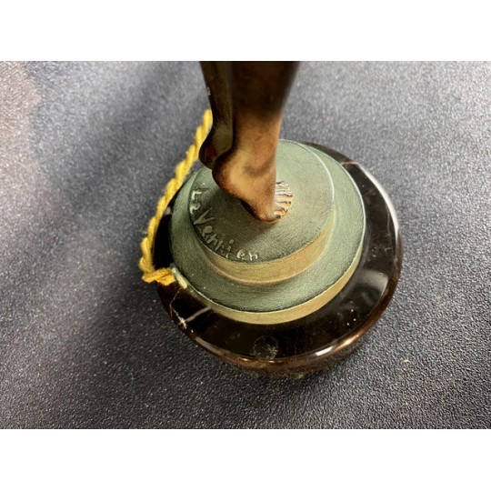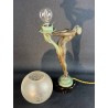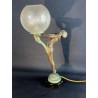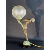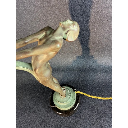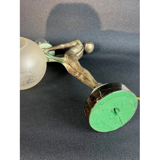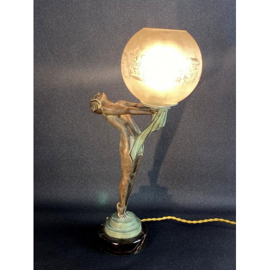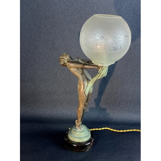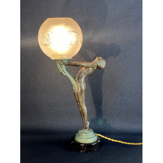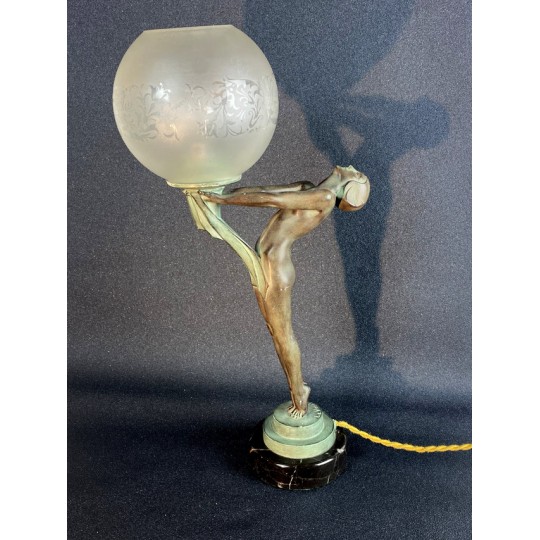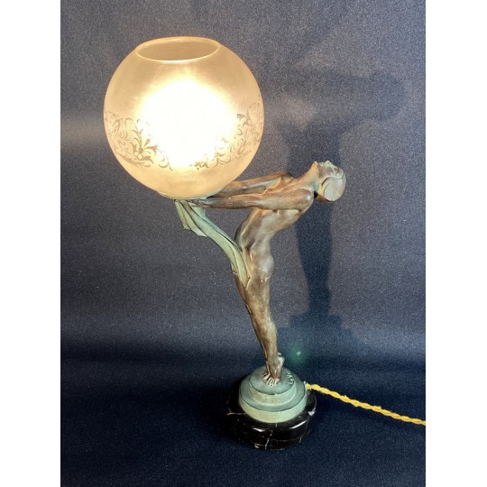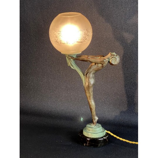 Art Deco table lamp entitled "Clarity" and depicting a standing naked dancer carrying at arm's length a spherical engraved glass globe Sculptor: Max Le Verrier. Signature / hallmarks: Le Verrier. Style: Very famous iconic sculpture of Art Deco. Date: Designed in 1928. Cast posthumously at the Max Le Verrier foundry in Paris. Material: Patinated metal on black veined marble base. Etched glass