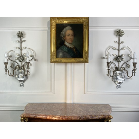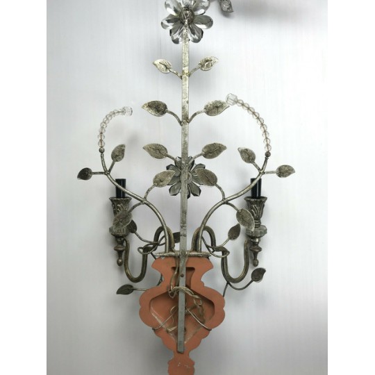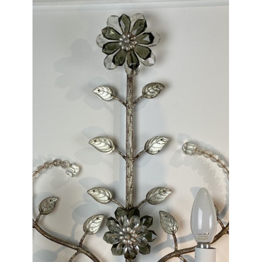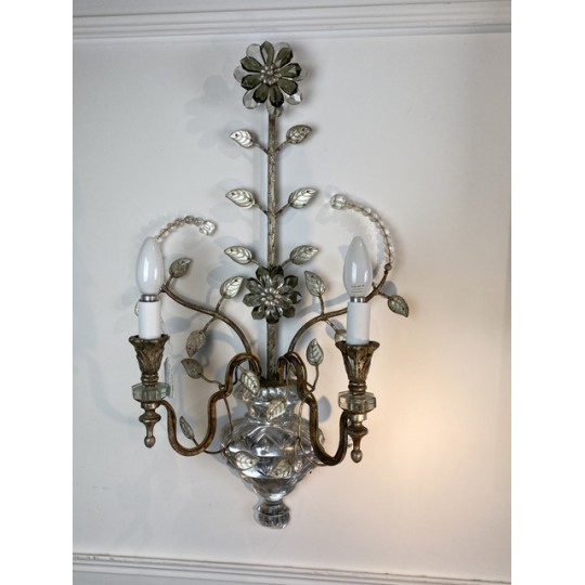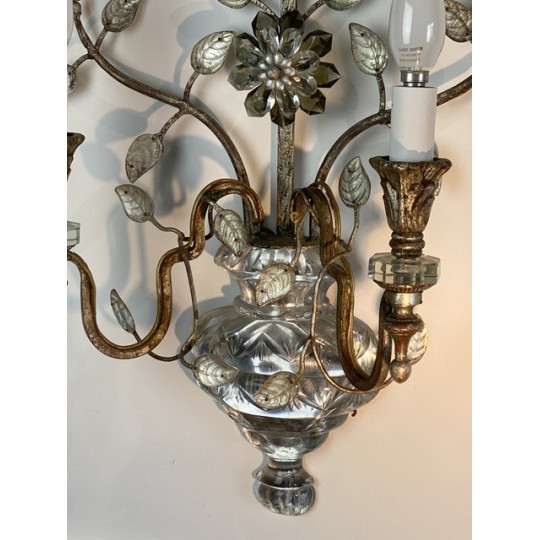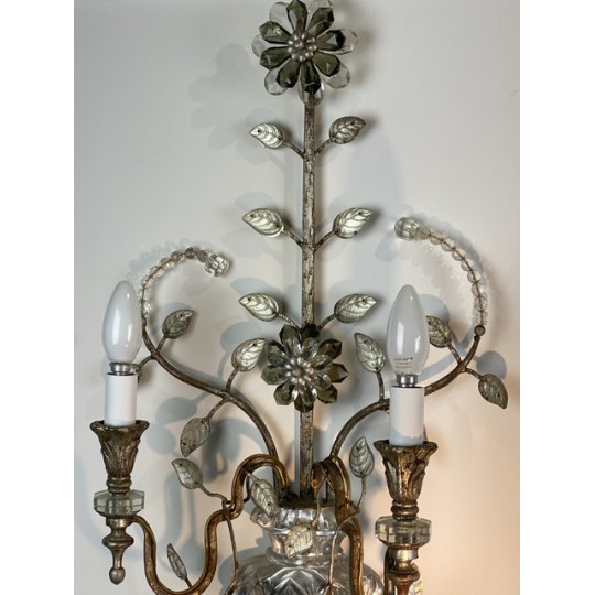 Large pair of wall lights from Maison Baguès from the 60s, in crystal and silver metal. The crystals of leaves and flowers intertwine around the structure. Chic and delicate, typical and iconic of Maison Baguès.