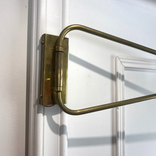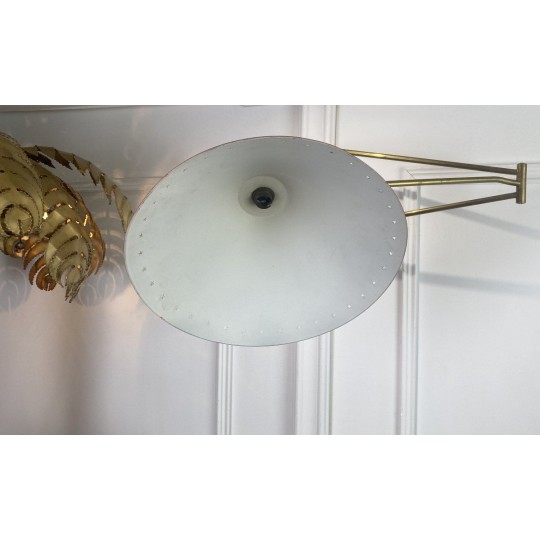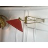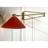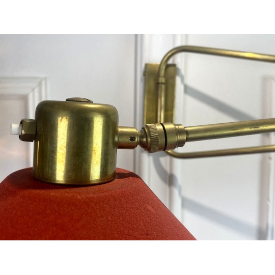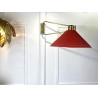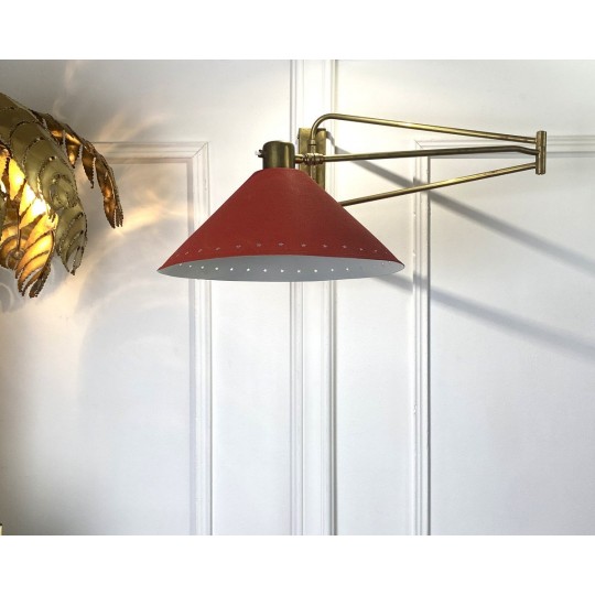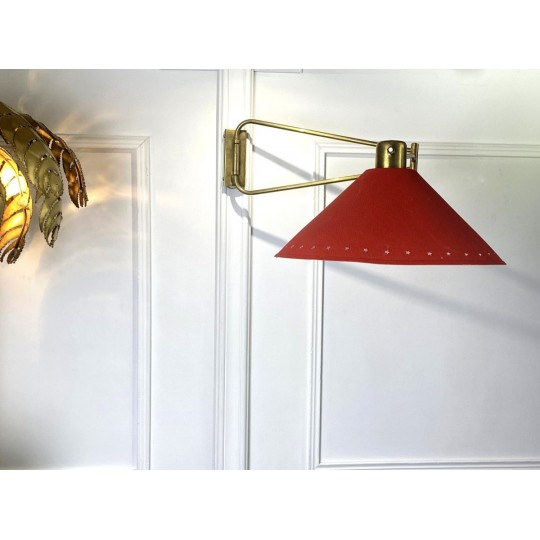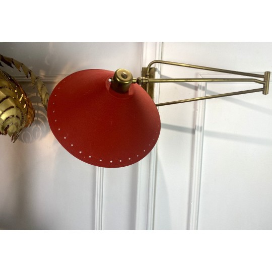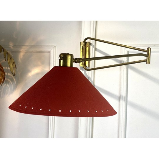 Vintage adjustable wall lamp Lunel edition by Robert Mathieu from the 50s. Adjustable wall lamp with adjustable lampshade consisting of a conical metal lampshade painted in granulated red perforated with stars on its perimeter mounted on an articulated brass arm. Switch on the lampshade support. Editions Lunel attributed to Robert Mathieu around 1955.