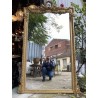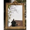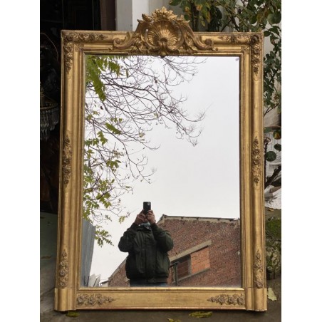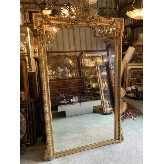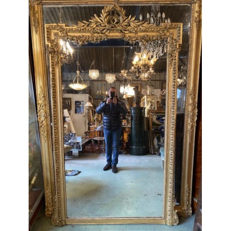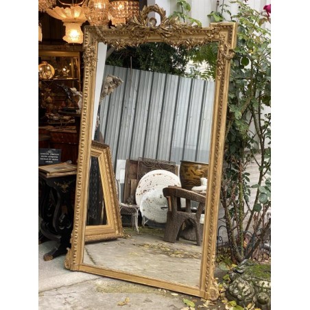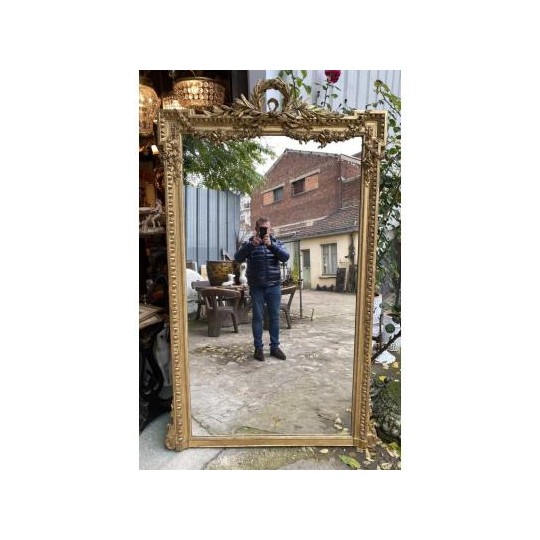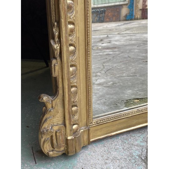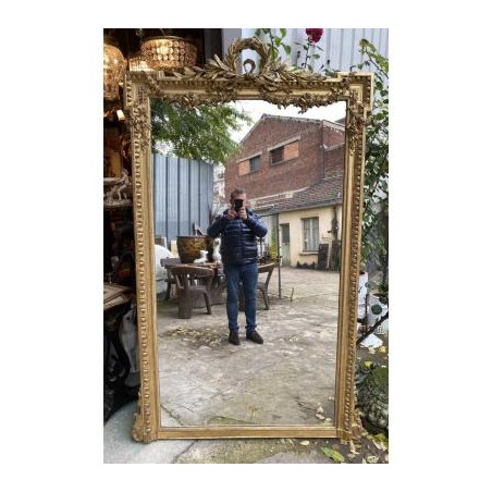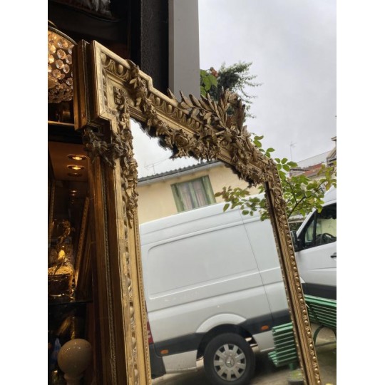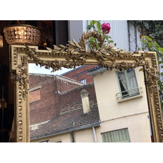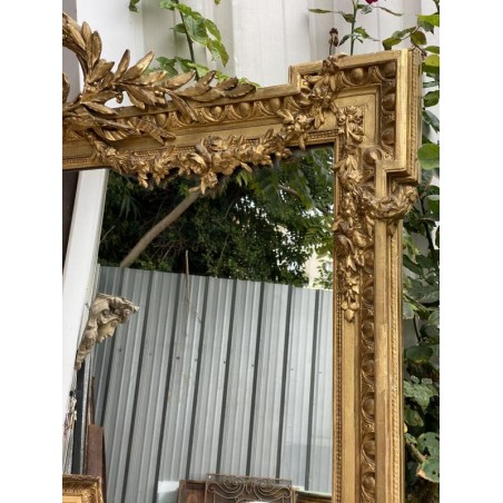 Large and elegant 19th century golden mirror, Louis XVI style, decorated with garlands of flowers and bay leaves. The whole is well preserved, some traces of old restorations. Small scratch on the ice. The ice is mercury.