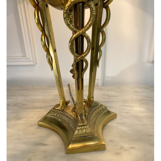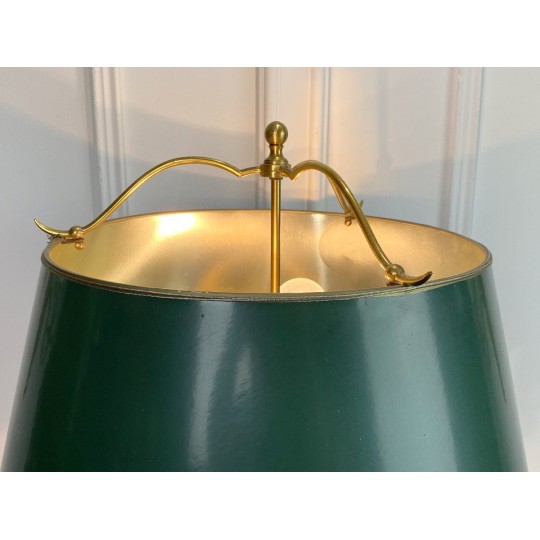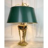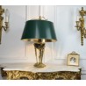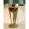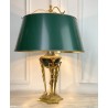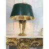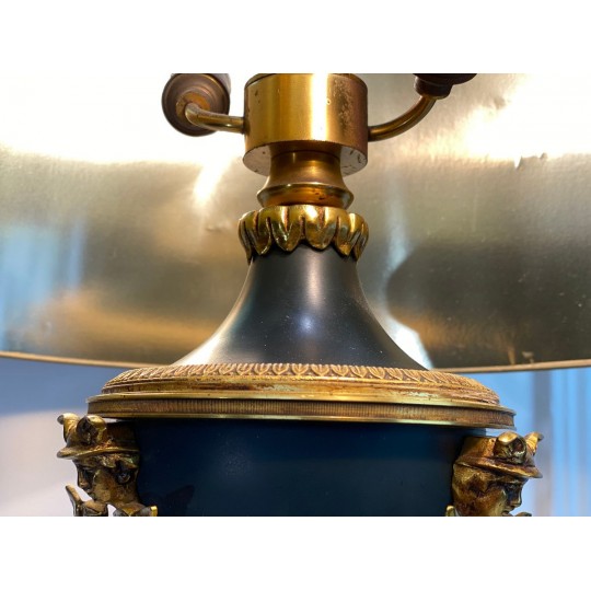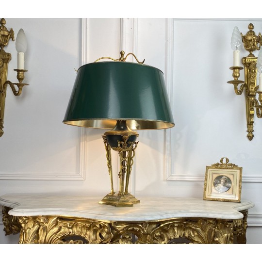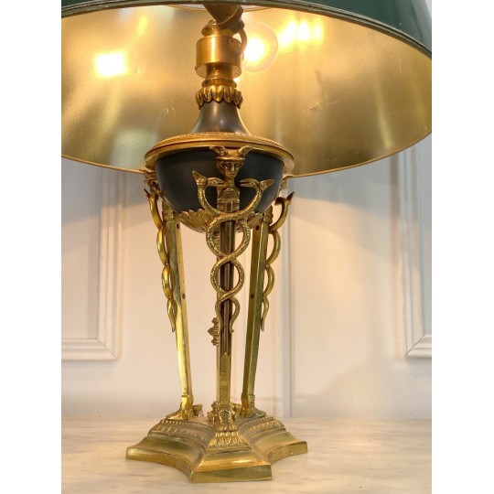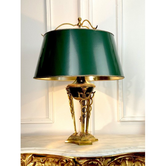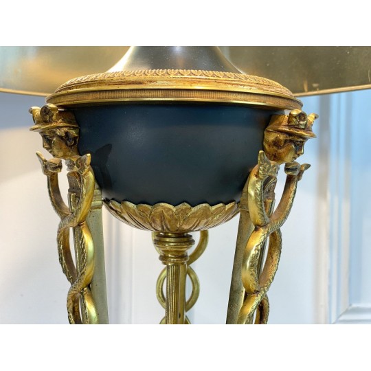 Lampe ancienne dîte lampe Bouillotte de style Empire orné de bronze patiné et doré. Abat jour en en carton peint à l'extérieur et doré à l'intérieur.