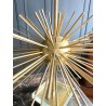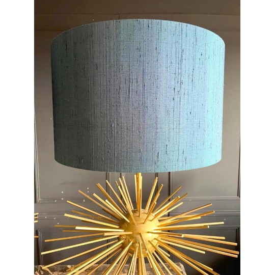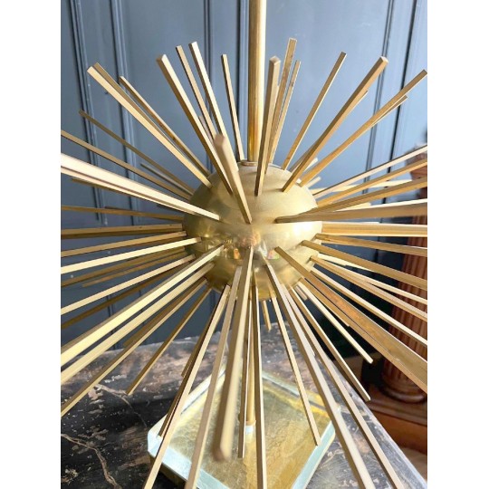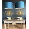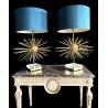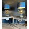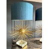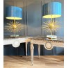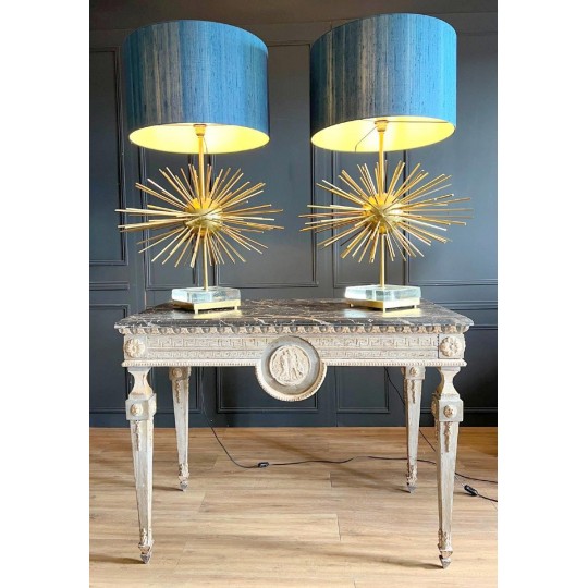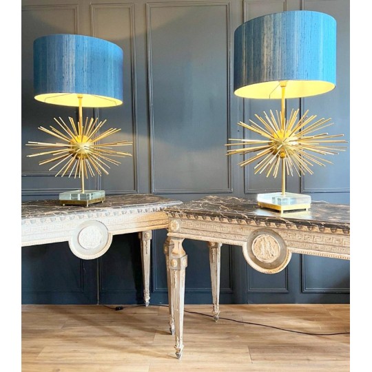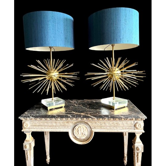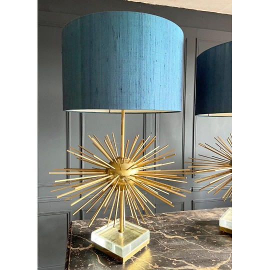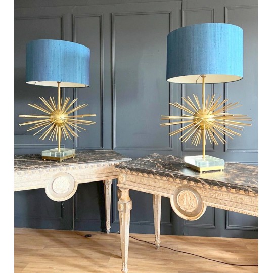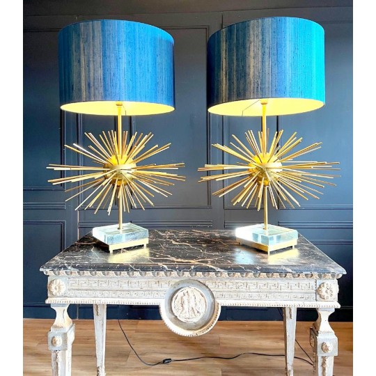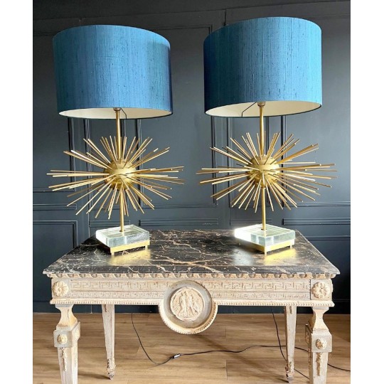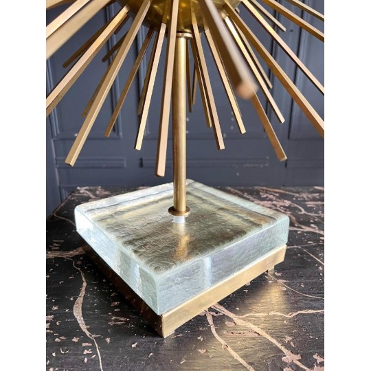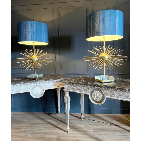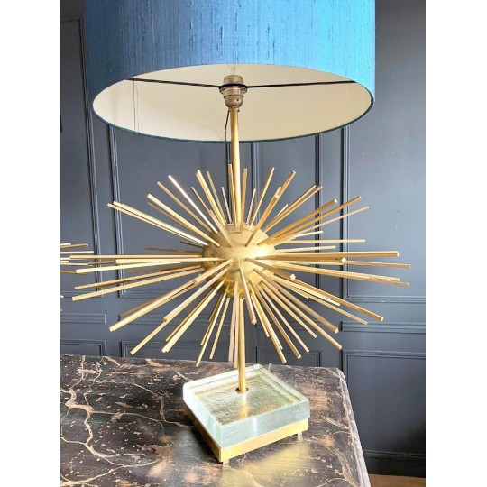 Paire de lampes Jansen Grand modèle en laiton et bronze. Année 70. EN forme d'oursin, reposant sur un socle formant un bloc de verre et laiton. Abat jour de couleur bleu canard.