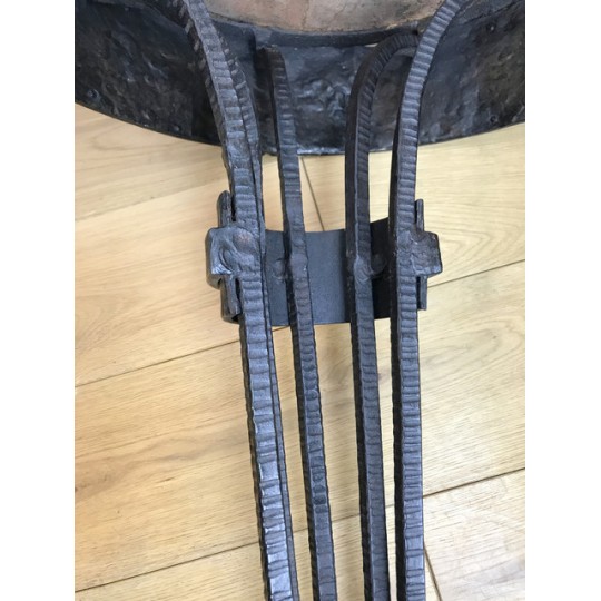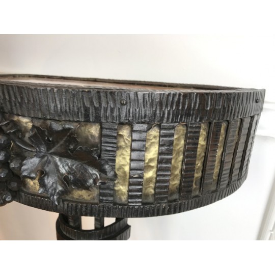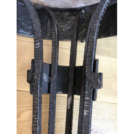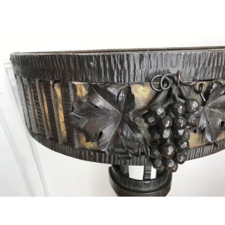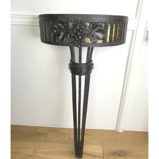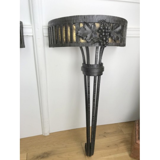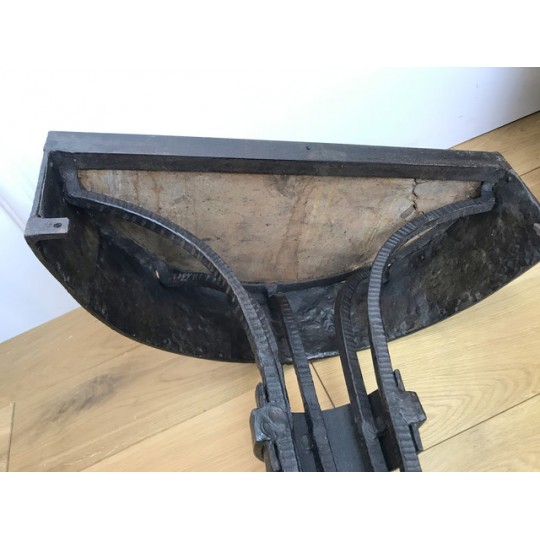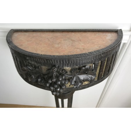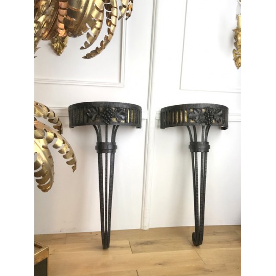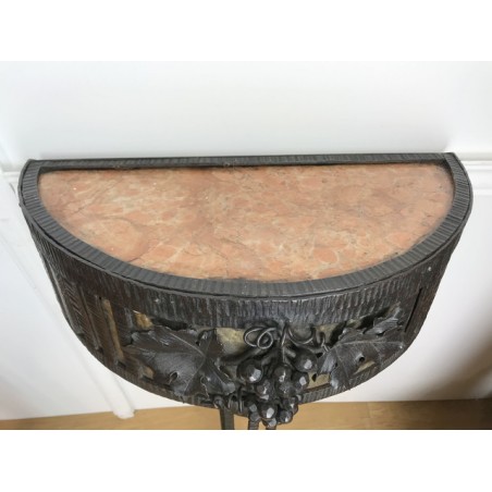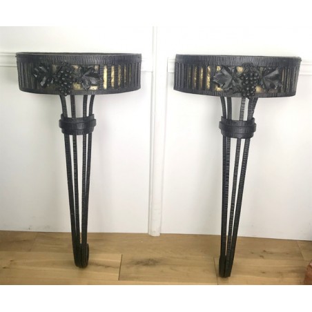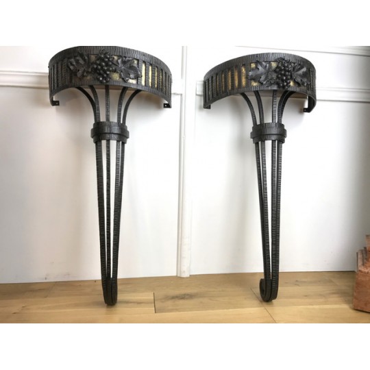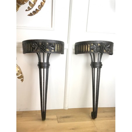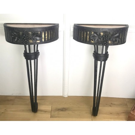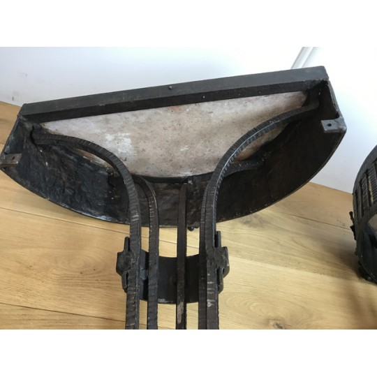 Paire de console, époque Art Déco, plateau en marbre, piétement central en fer forgé travaillé et patiné. Travail d'époque Art Déco