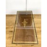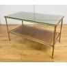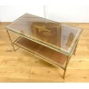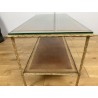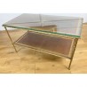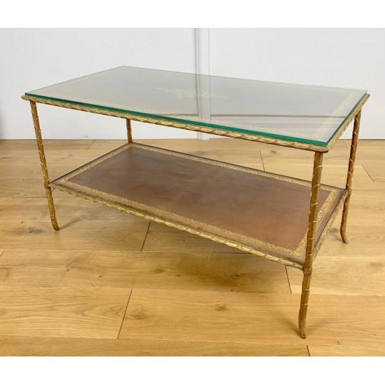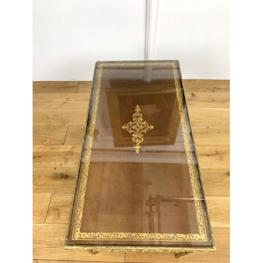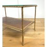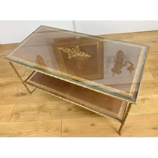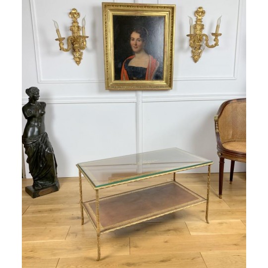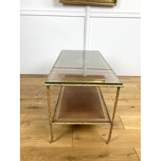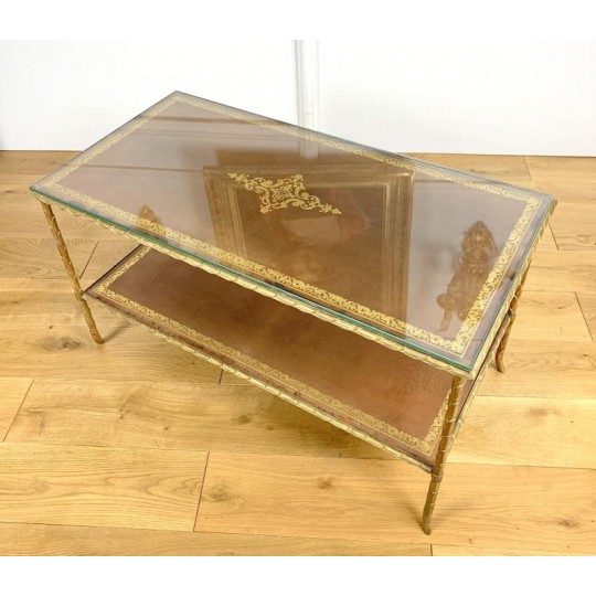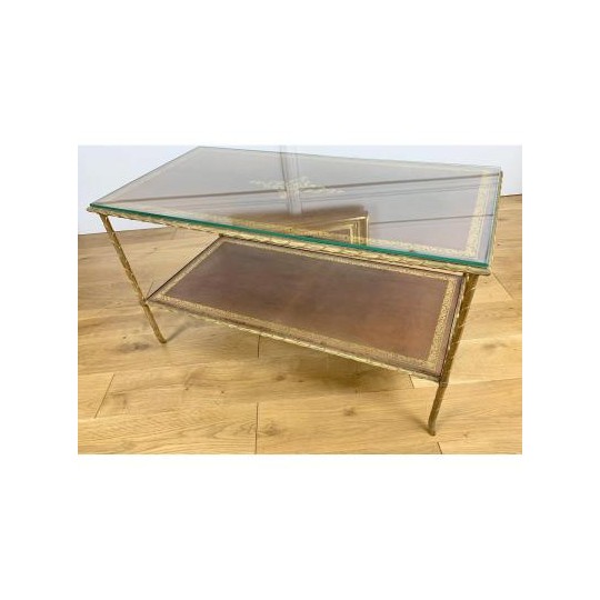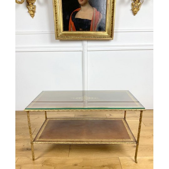 MAISON BAGUES, Tables basse avec monture en bronze doré et dessus plateaux cuir et please en verre trempé.
