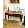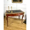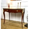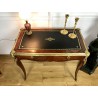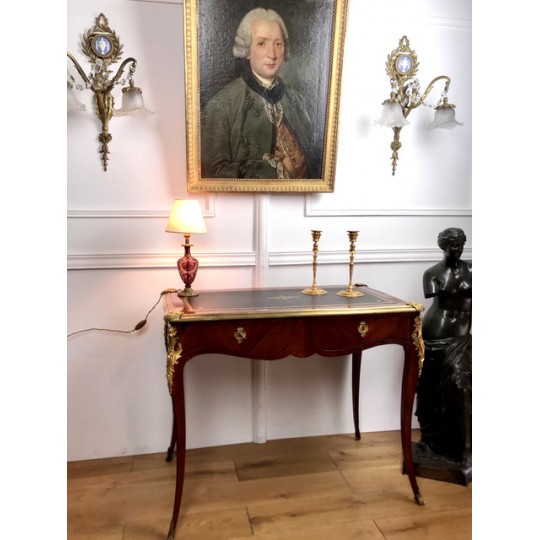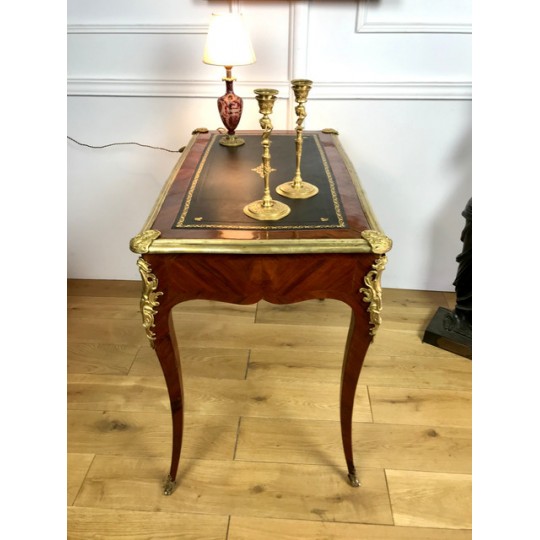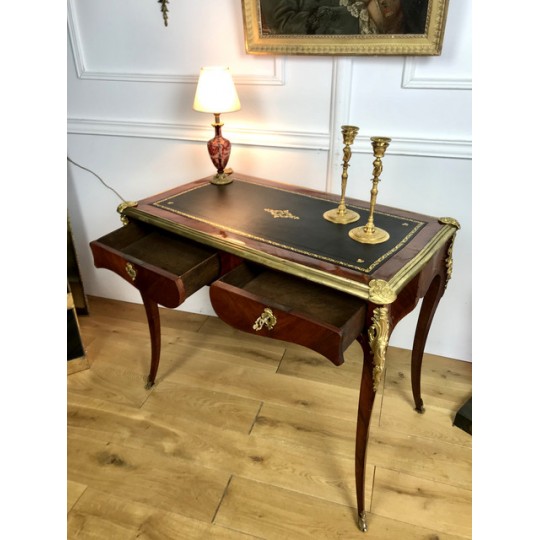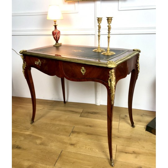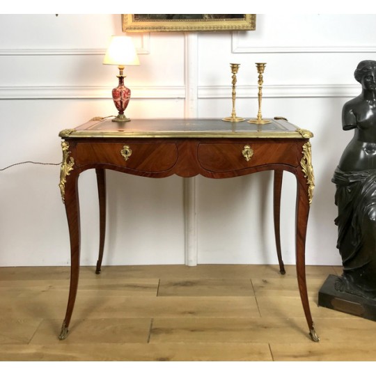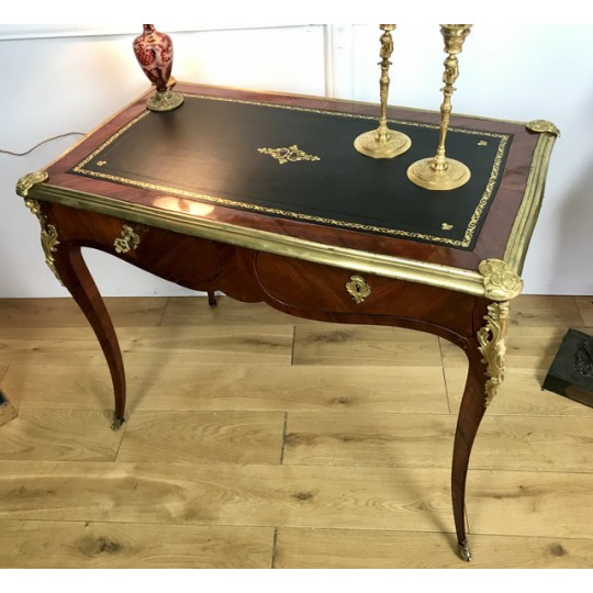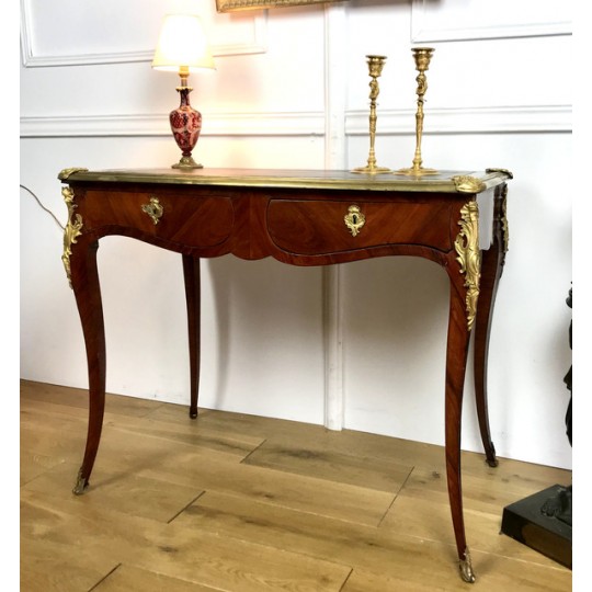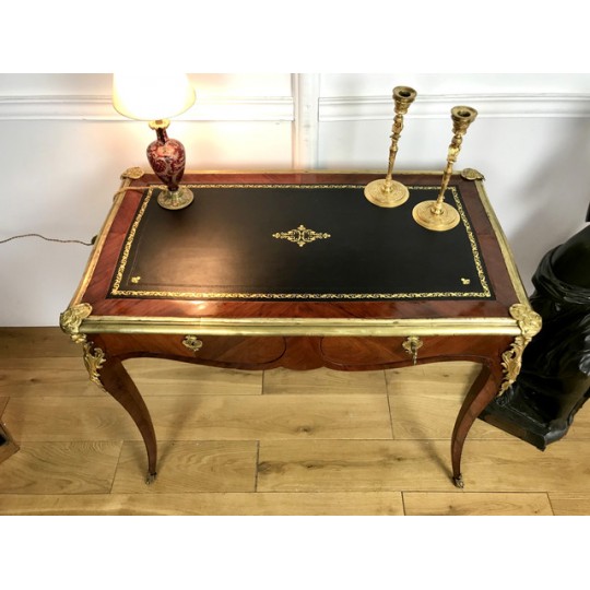 Bureau de dame 18ème, époque Louis XV en marqueterie de bois de rose orné de bronze avec dessus cuir noir. Il ouvre par deux tiroirs et repose sur quatre pieds galbés avec des sabots en bronze. Très bon état avec dessus cuir neuf.