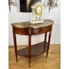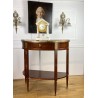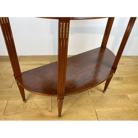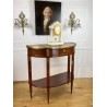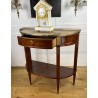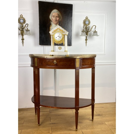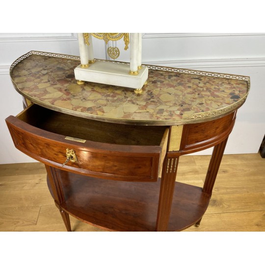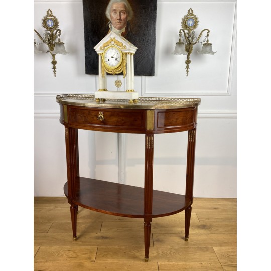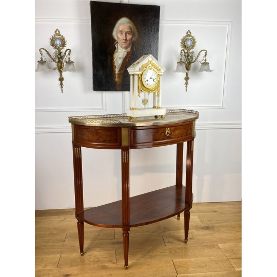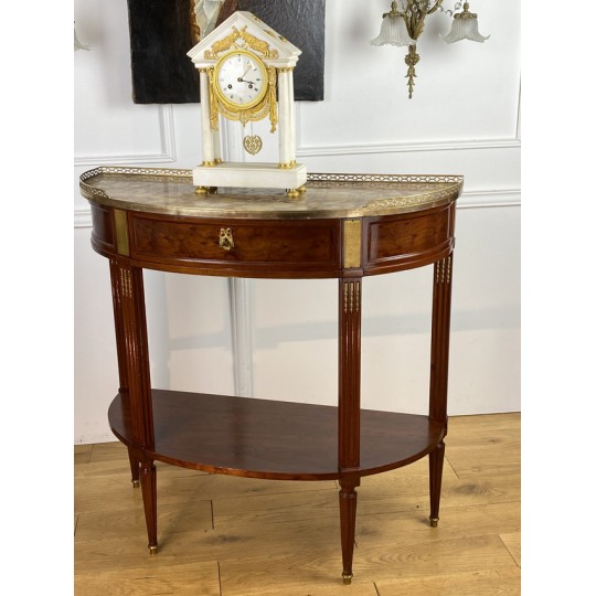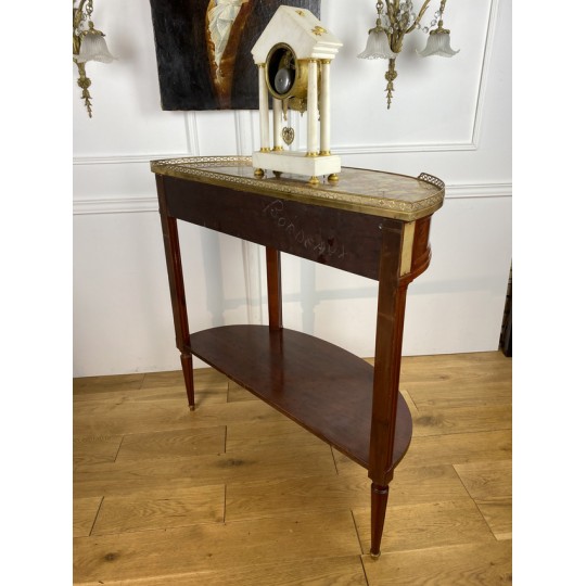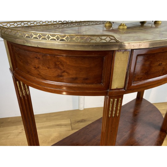 Désserte demi-lune du 19ème, de style Louis XVI, en acajou moucheté, dessus marbre, orné d'une galerie en laiton.