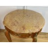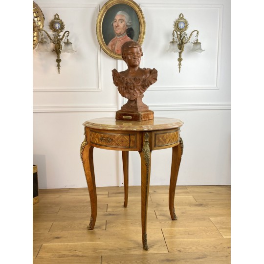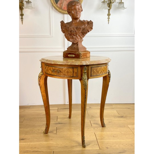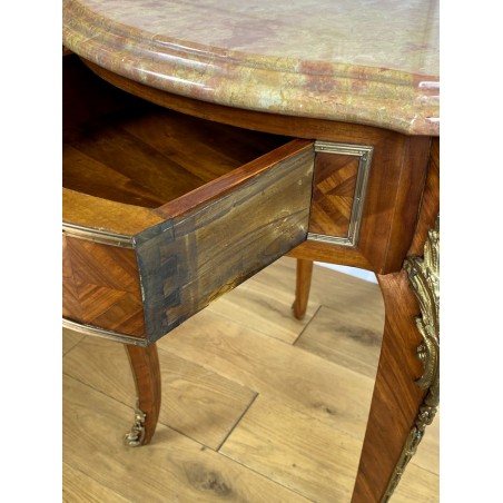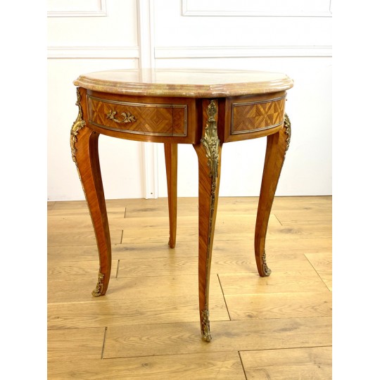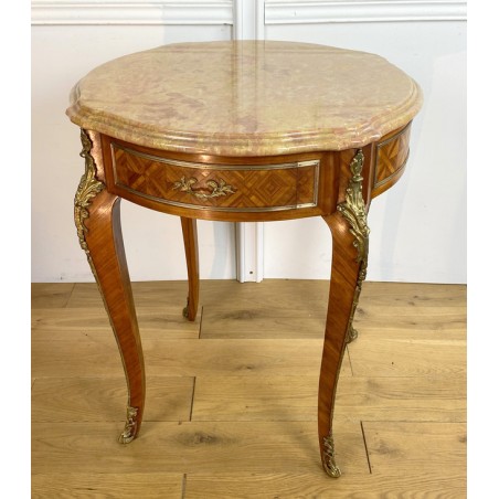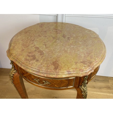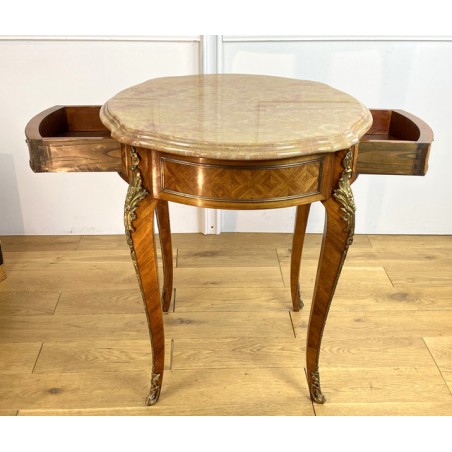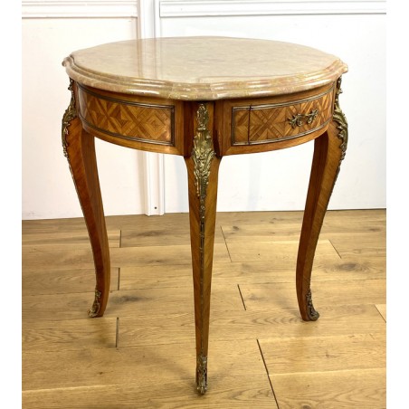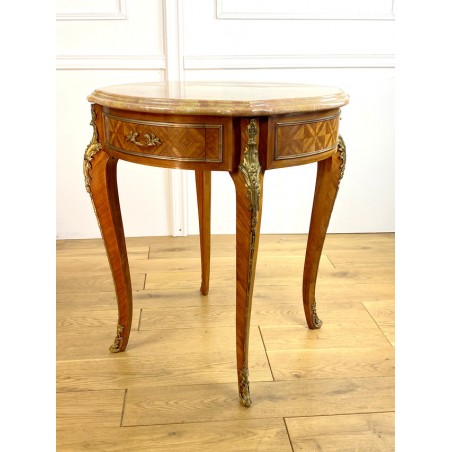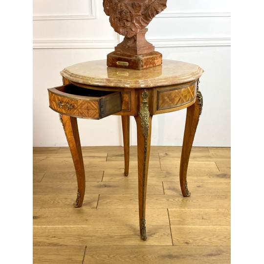 Guéridon ancien en marqueterie,orné de bronze avec dessus marbre de Style Louis XV à deux tiroirs