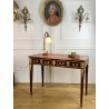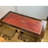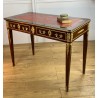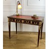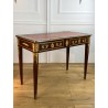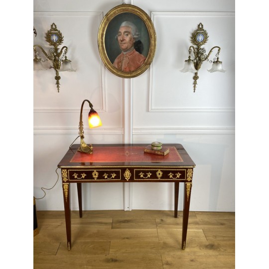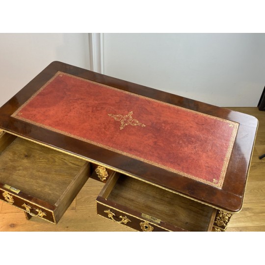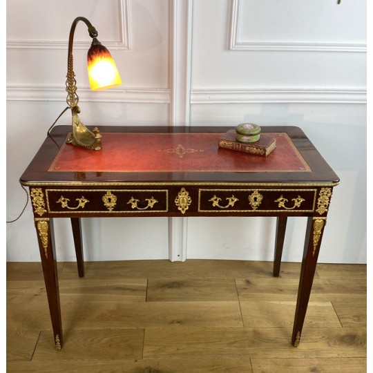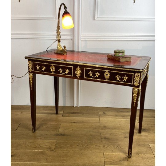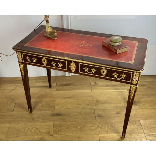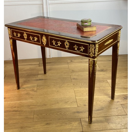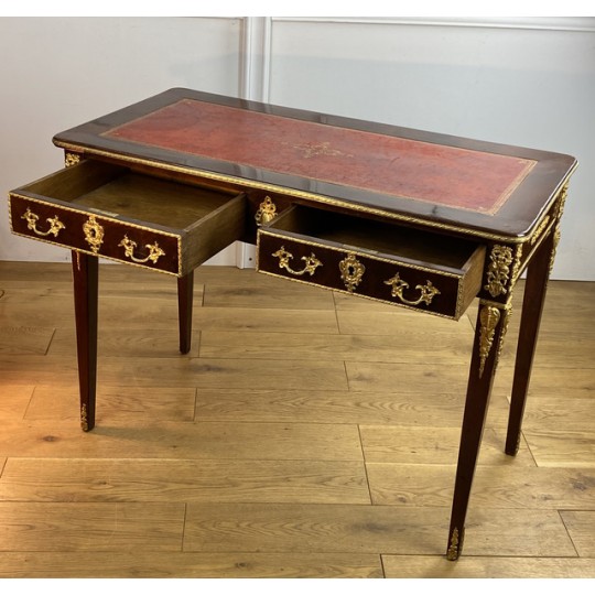 Bureau 19ème de style Louis XVI en acajou flammé orné de bronze doré à décor de chutes feuillagés avec cuir rouge. Ouvrant par deux tiroirs en ceinture, reposant sur quatre pieds en gaine. Rapporté doré au petit fer