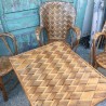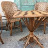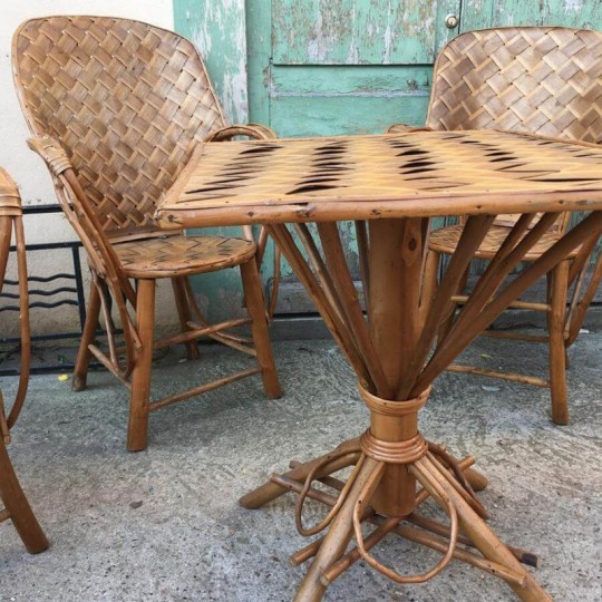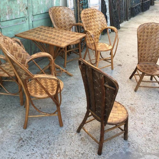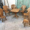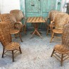 Belle ensemble de salon de jardin composé de 7 pièces : 4 fauteuils, 2 chaises et une table rectangulaire, fabrication des années 1970. La structure est assemblage de branche de bois et les parties tressées sont en feuillage de châtaignier.