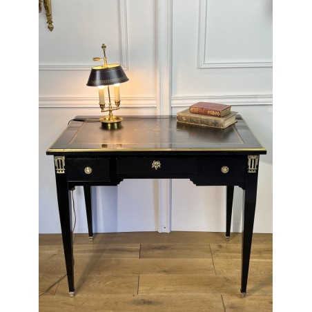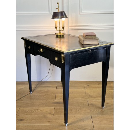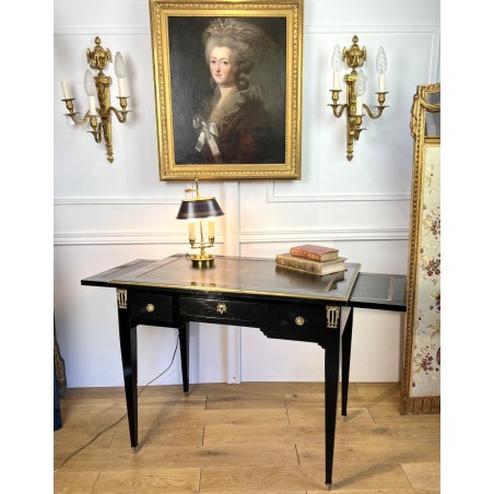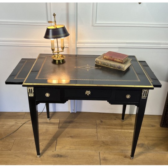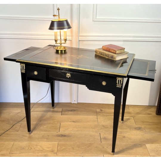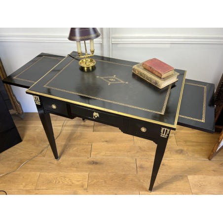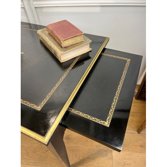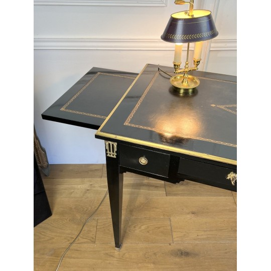 Bureau plat à tirettes de chaque côté en acajou noirci avec dessus cuir, en très bon état. De style Napoléon III, ouvrant par tiroirs ( livré avec la clé du centre )