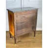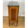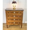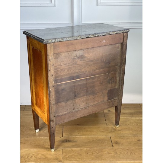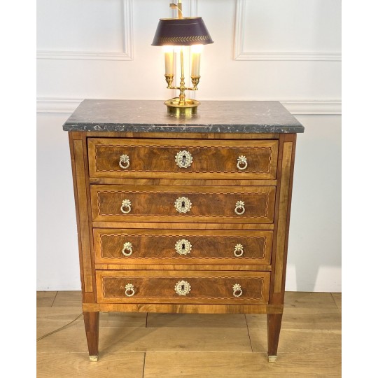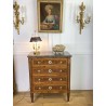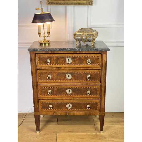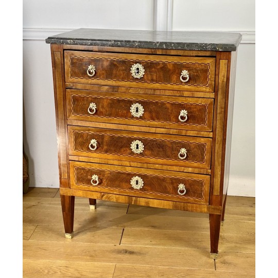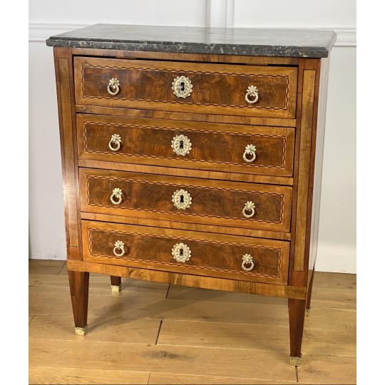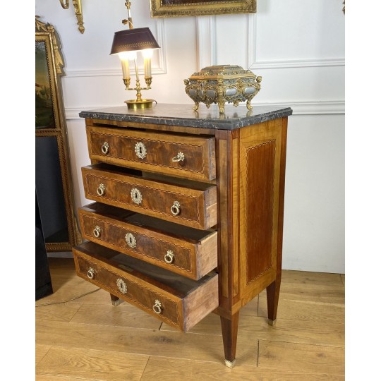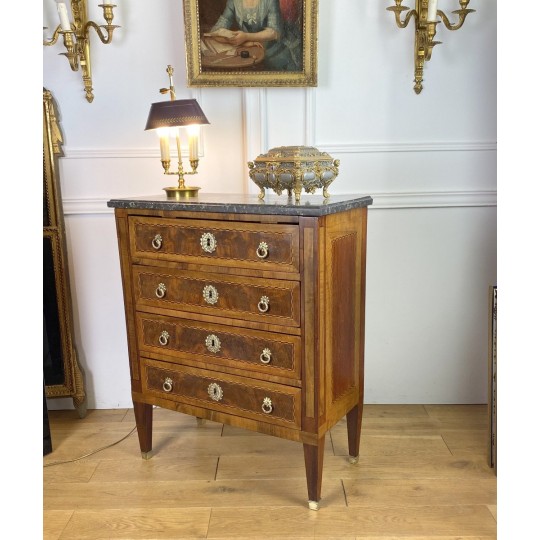 Commode 18ème Epoque Louis XVI en marqueterie dessus marbre ornée de bronze. Elle s'ouvre par quatre tiroirs