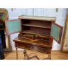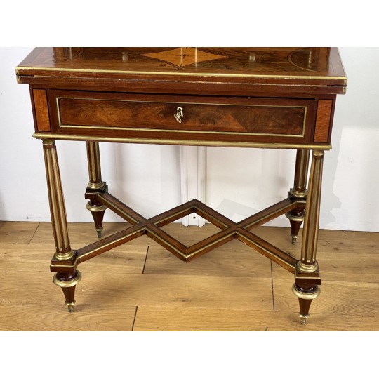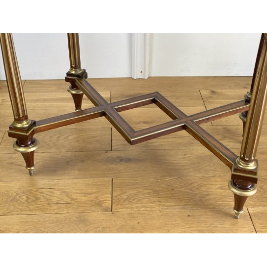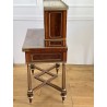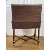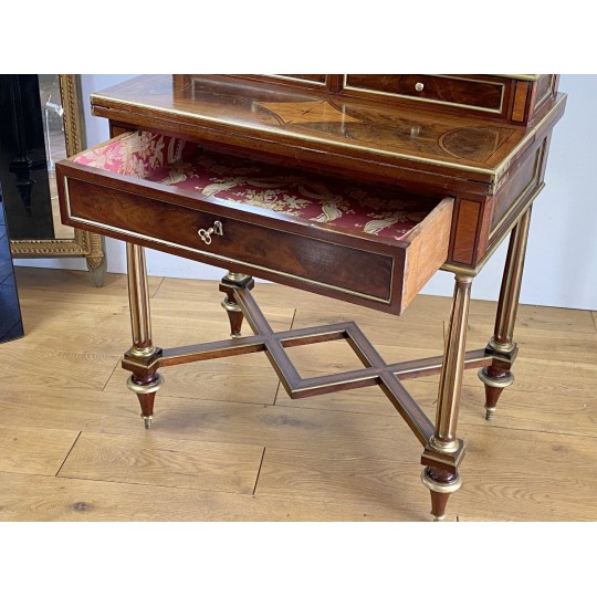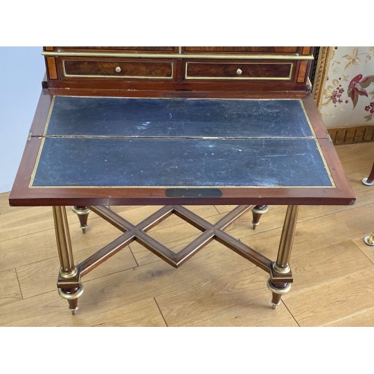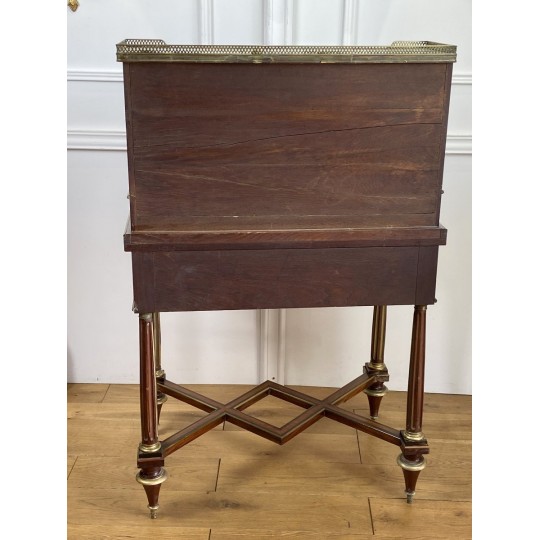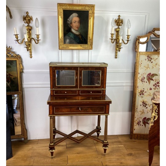 Bureau dît 'Bonheur du jour" du 18ème siècle Epoque Directoire en acajou avec ses filets en laiton. Reposant sur quatre pieds fuselés et une entretoise à croisillons. Son plateau se déplie avec un dessu cuir. Les deux miroirs du gradin sont au mercure. Le dessus est en marbre orné d'une galerie en laiton. Treès beau travail parisien fin 18ème.