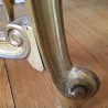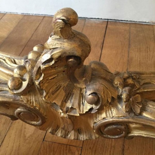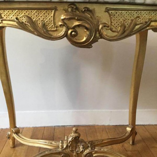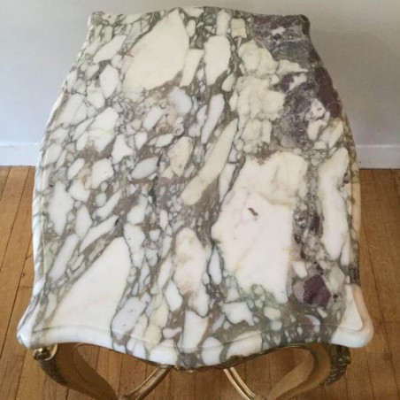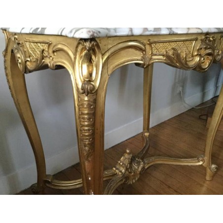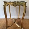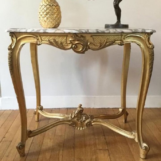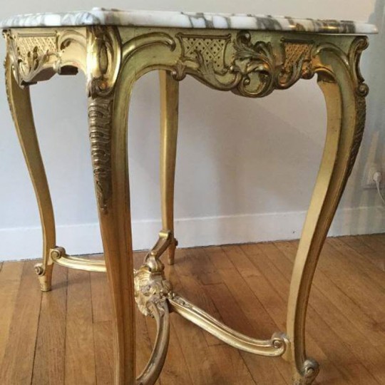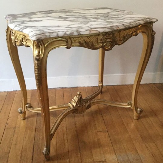 Charmant guéridon / table de milieu de style Louis XV en bois doré et sculpté, le plateau est un marbre blanc veiné. Elle repose sur 4 pieds cambrés, réunis par une entretoise sculptée.