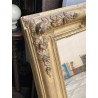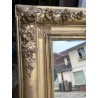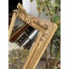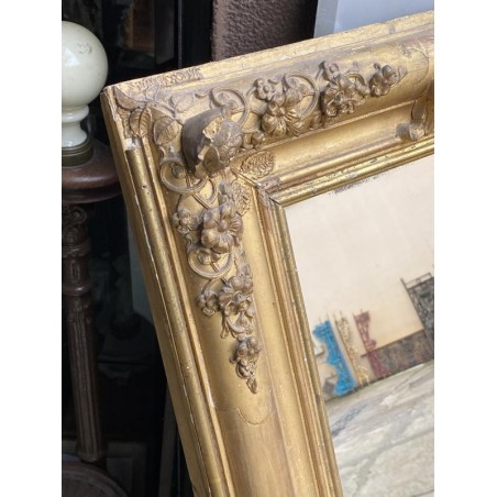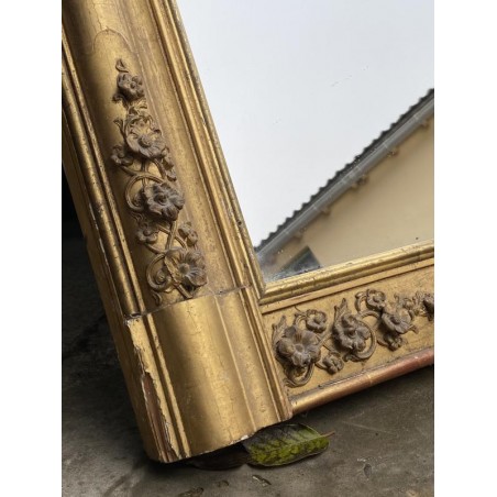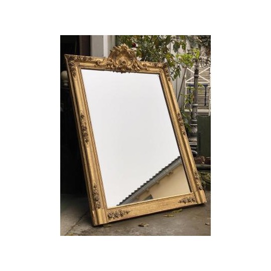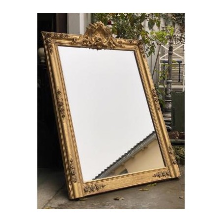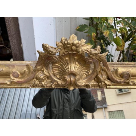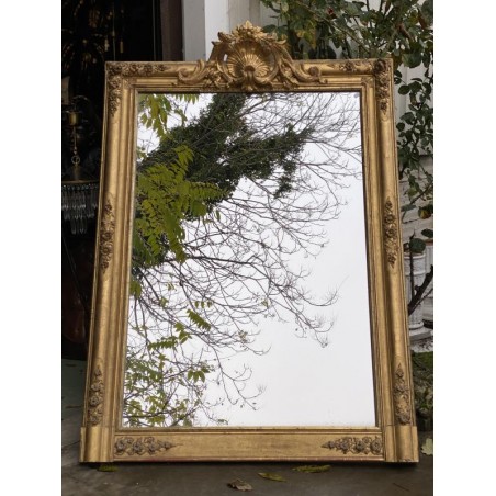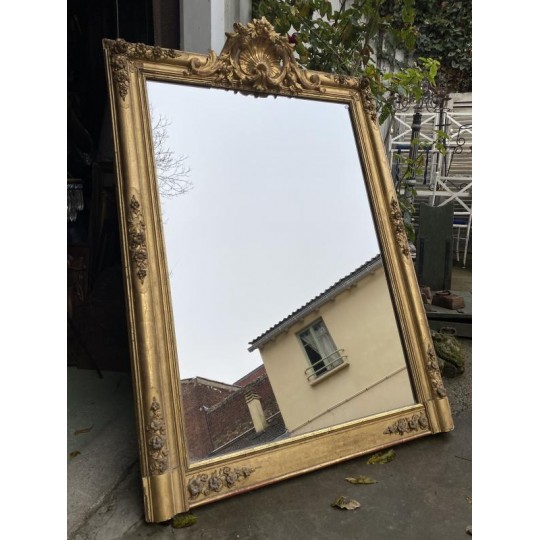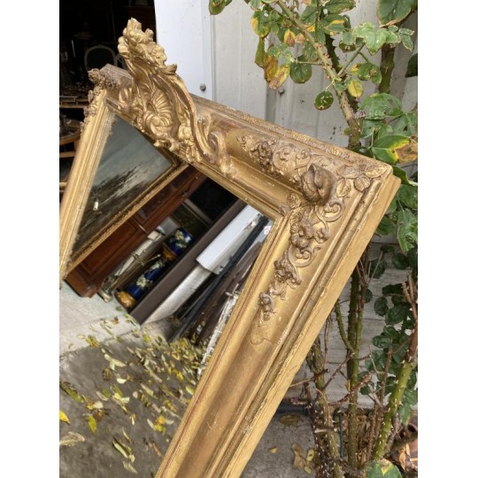 Grand miroir de cheminée XIXème, en bois et stuc doré à fronton, de forme rectangulaire, glace d'origine au mercure. Bon état général, quelques petits sauts de stuc et dorure par endroits.