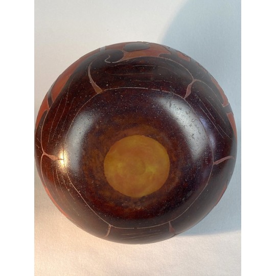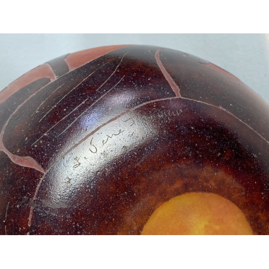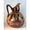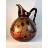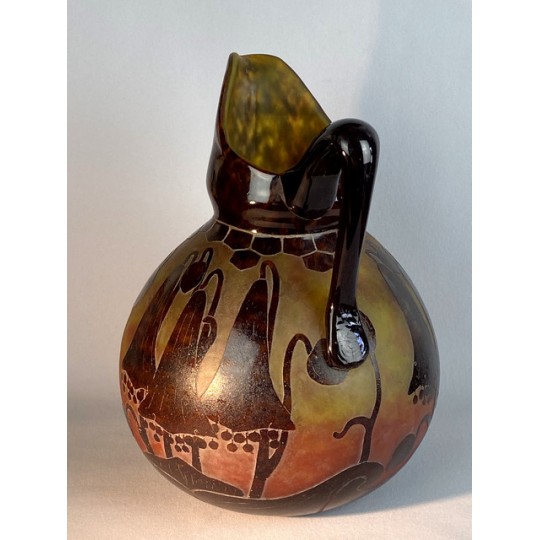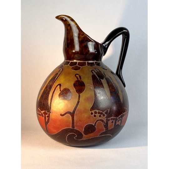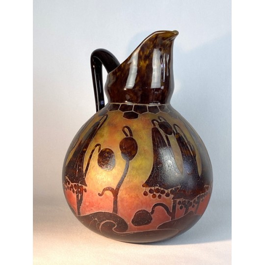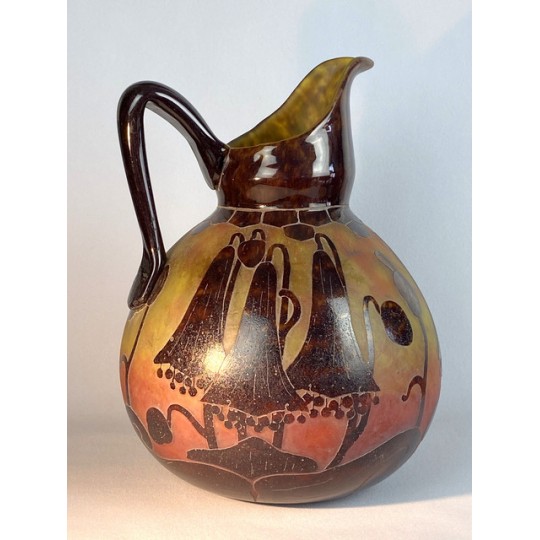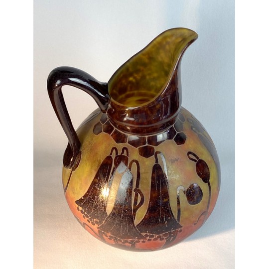 Pichet signé Le Verre Français, en verre dégagé à l'acide, à décor de campanules sur fond nuance rouge, orange, jaune.