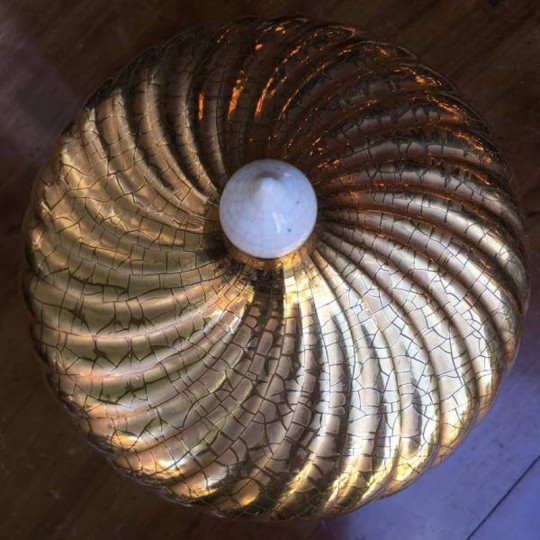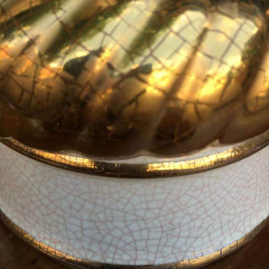 Belle bonbonnière en faïence craquelée de Longwy de couleur beige et doré. Elle est en bon état et elle est estampillée sur l’envers (voir photos).