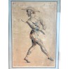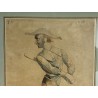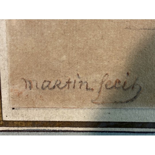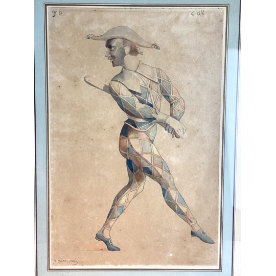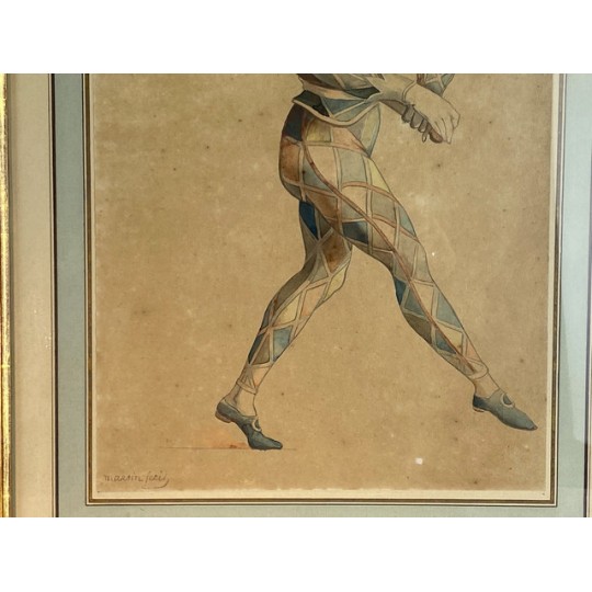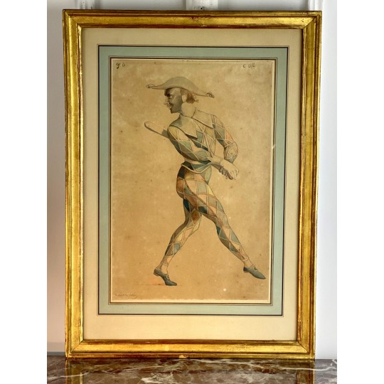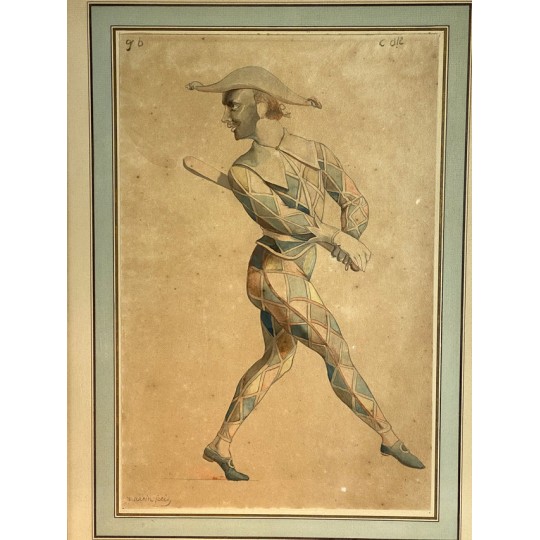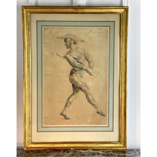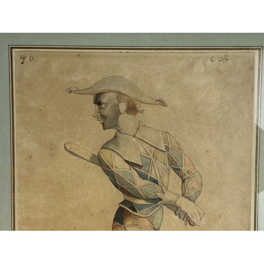 Aquarelle sur papier signé Martin Fecit, comédien de la comédia del Arte en costume d'Arlequin