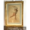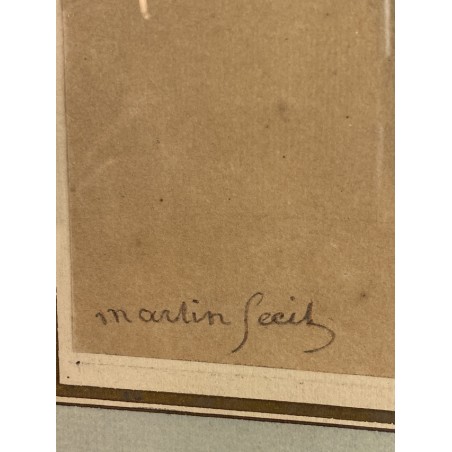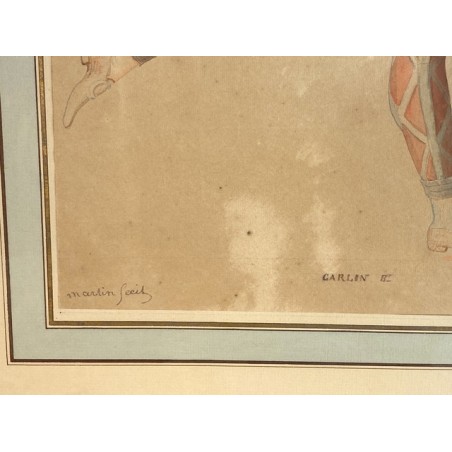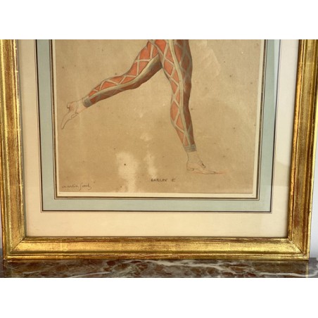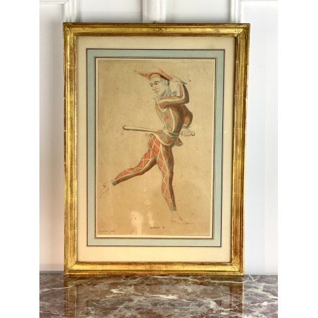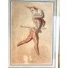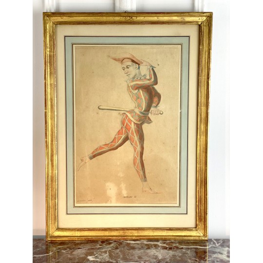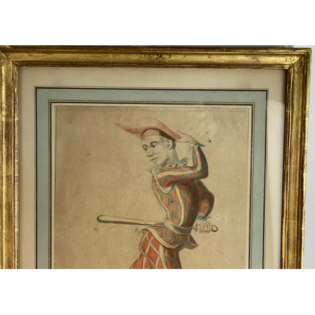 Aquarelle sur papier signé Martin Fecit, comédien  de la comédia del Arte en costume d'Arlequin