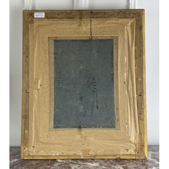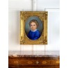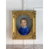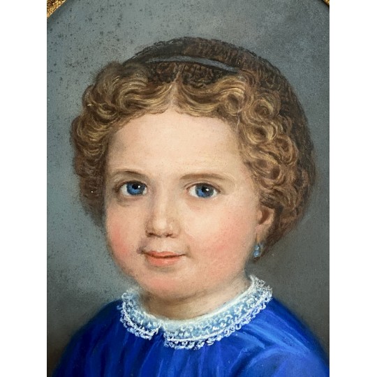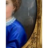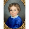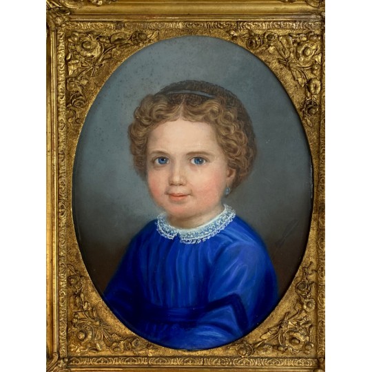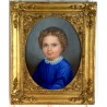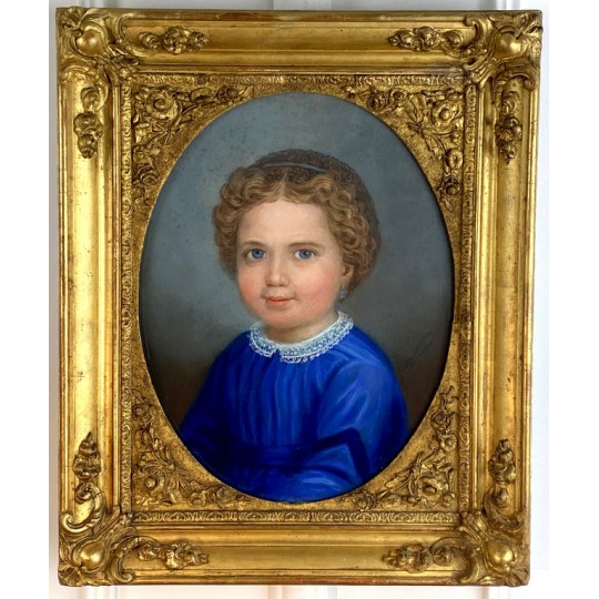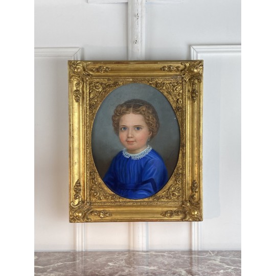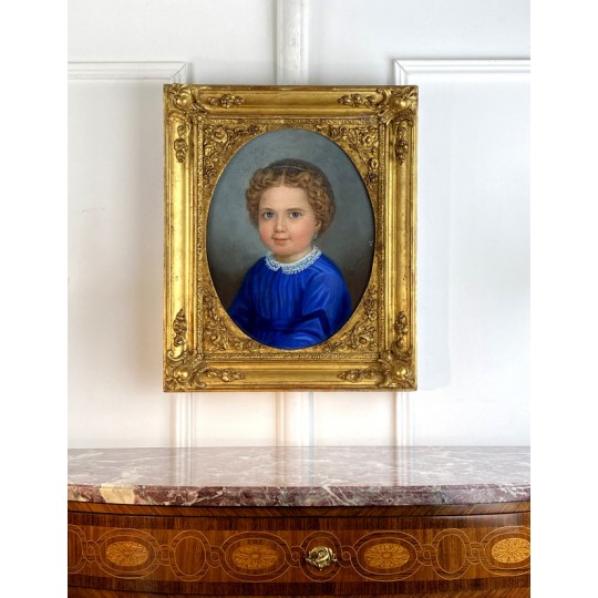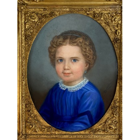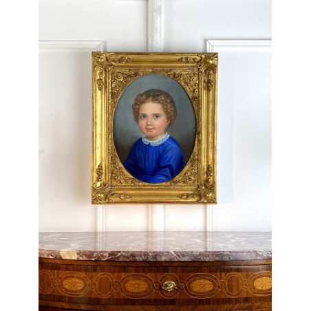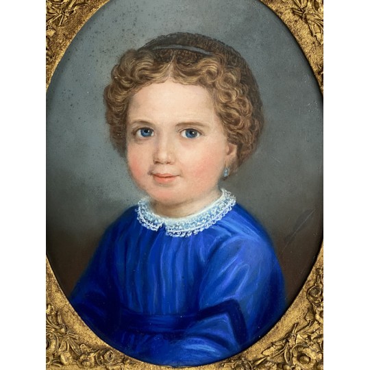 Pastel ancien du XIXe sous verre représentant le portrait d'une jeune fille avec un très beau cadre