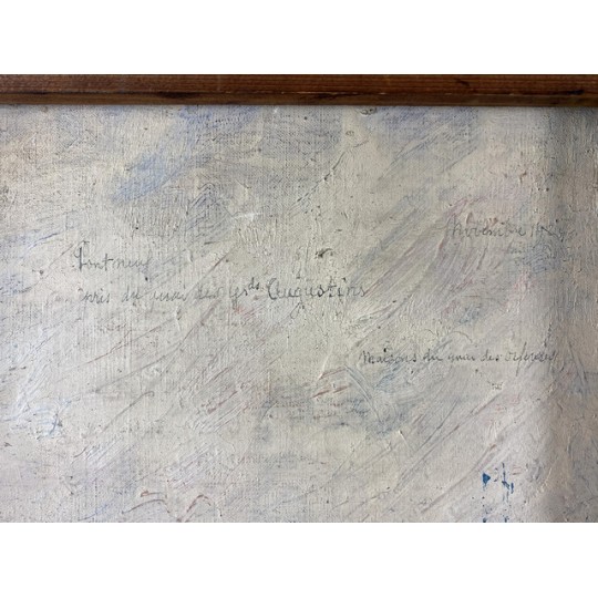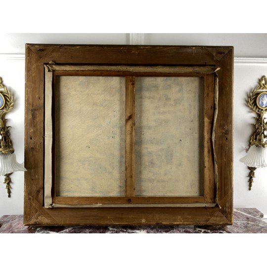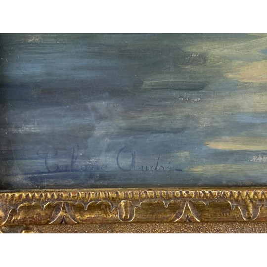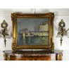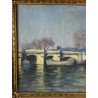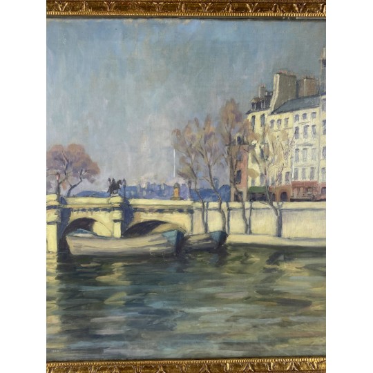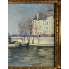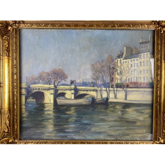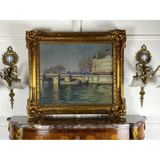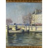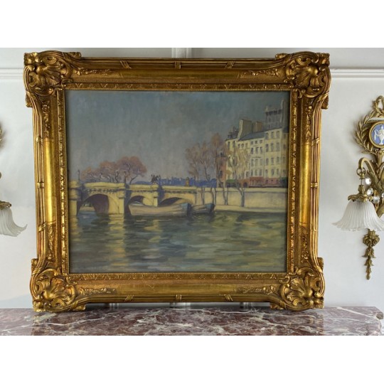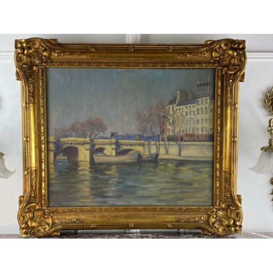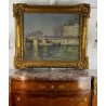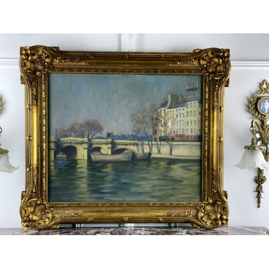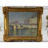 Tableau / Huile sur toile sous verre signé André Cabane, "Le pont Neuf" à Paris. Fait en novembre 1924, encadré dans un superbe cadre en bois et stuc doré de l'époque.